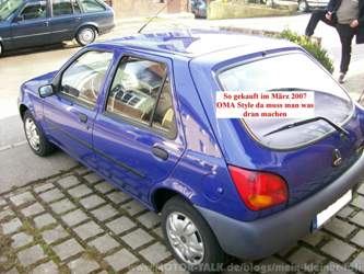 Ich war geschockt die Reperatur wurde mit neuen FAhrwerk un neuen Teilen auf ca 1000€ geschätzt. Ich dachte nur mhh ds Auto hat in 2monaten TÜV so kommt er niemals durch, und ich überlegte mir das Auto noch für ca 1000€ zu verscherbeln. Aber anderseits dacht ich mir dann hab ich wieder nur ca 2000€ zur Verfügung un hab wieder nur ne Wundertüte als Auto. Schweren Herzens entschloß ich mich das auto richten zu lassen. Ich kaufte ein Weitec Sportfahrwerk für ca. 400€ und den Rest ließ ich in einer Ford Werkstatt autauschen und reparieren. Gesammte Reperatur betrug mit FAhrwerk ca 1100€. Da musste ich echt schlucken. Als dann mein auto repariert war war ich erstmal begeistert. Es fuhr sich viel besser und komfortabler und wirkte nicht mehr so ausgelutscht. Dann wurde es schon Februar 2009. Der TÜV wartete, ich dachte nur ja da wird der gut durchkommen ist ja alles neu. Leider musst ich schmerzhaft feststellen das der TÜv mich durchfliegen lassen hat weil Wasser von der Motorhaube in innenraum gedrungen ist un die Bodenbleche unter dem teppich durchgerostet waren. Das hieß neue Bleche einschweißen, was nochmals ca 230€ kostete. Endlich hatte er wieder TÜV. War ein teurer spass wenn man bedenkt ca 1300€ Reperatur nur damit er durch den TÜV kommt und wieder etwas besser zu fahren ist. Zum ZEitpunkt der großen Reperatur hatte er ca 141000km drauf. So nun war ich erstmal wieder glücklich. Leider hat mein Radlauf nicht allzuviel ausgehalten. Das Blech war total durchgerostet. Ein Kumpel der schweißen konnte hat mir ein neues Blech eingeschweißt, den Rost entfernt und gezinnt gespachtellt und alles ordentlich verschliffen. Danach ging es zum Lackierer der nochmals 100€ verlangte. Dann suchte ich noch optik ich kam günstig an Karosserie und Fzg. Teile eines Abwrackfiestas dran. So tauschte ich noch eine Heckklappe, die hintere Türe und Stoßsstangen in Wagenfarbe aus. So das war mal im groben und ganzen die Geschichte. Wenn ich alles ausführlich erzähl bin ich morgen noch dran. Ich füge nun noch Bilder hinzu und eine Listte mit den Arbeitsvorgängen die nötig waren.