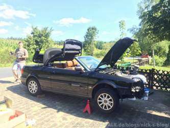 2,5 Wochen vergehen bis ich an einem Sonntag den Venga nach erfolgreicher Tour wieder gegen mein Cabrio tausche. Am selben Tag geht es noch nach Stuttgart zu meinen Eltern für ein paar Tage. Bei Heilbronn, ca. 1 Stunde vor Ankunft beginnt die Kühlwasserleuchte in Kurven zu blinken. In der Stuttgarter Innenstadt angekommen blinkt sie durchgängig. Kurz angehalten, Wasser aufgefüllt, weiterfahren. Es ist schon spät und ich habe über 1000km hinter mir. Sofort am nächsten Tag mache ich mich daran zu schauen, wo das Wasser rausläuft. Zu erkennen ist allerdings nichts. Auch an den folgenden Tagen tropft kein Wasser unter dem Auto, nur Öl, mehr als je zuvor. Scheiße. Allerdings ist weder Rauch am Auspuff noch Wasser im Öl zu erkennen. Naja das wird schon gut gehen, dachte ich mir am Donnerstag als ich mich auf den Weg zu Flo mache, wo die Youngstes sich treffen um zusammen die IAA zu besuchen. Am Rastplatz fülle ich immer wieder Wasser auf. Als ich bei Flo ankam dann die Erkenntnis: So geht es nicht bis nach Hamburg. Das Auto nimmt sich über einen Liter Wasser auf 100km.