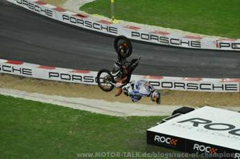 Was nicht so gut ankam war die Vorstellung des einhundertsten ausgelieferten Tesla Roadsters. Zwei Fahrzeuge fuhren ein geräuschloses Rennen. Das ist kein Racing und führte auch zu bösen pfiffen und einer der Motorradfahrer für die Pausenfüllung startete auch mal kurz seine Maschine in der totenstillen Arena was zu spontanen Applaus führte.