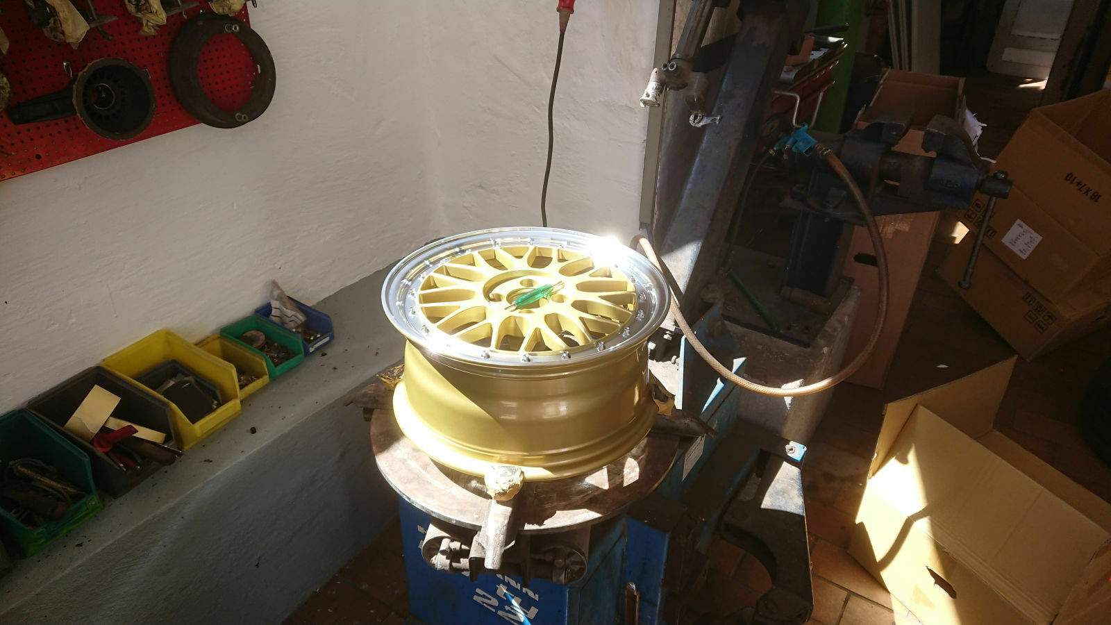 Und nun das Highlight. Um die Saison ordentlich zu starten brauchte Bodo der Bruiser noch Sommerreifen. Hierbei habe ich mich für 16'' entschieden, da diese (beim M3) die größte Serienbereifung des E30 darstellt. 17'' ginge auch noch, ist aber für mich das absolut denkbare Maximum, alles darüber sieht IMHO albern aus. Als Felgen habe ich mich für eine BBS Replika der deutschen Firma IB Alurad entschieden. Die Le Mans Youngtimer kommt in 7Jx16 4x100 mit Gutachten, hat mit der ET25 viel Platz für eine größere Bremse und ist für ca €700 neu meiner Meinung nach ein Schnapper. Das Ganze wurde dann mit ACS3000 versiegelt und hoffentlich standfest gemacht! Also gelernt, wie man Reifen aufzieht und auch ganz bestimmt nie was dämliches verbockt...