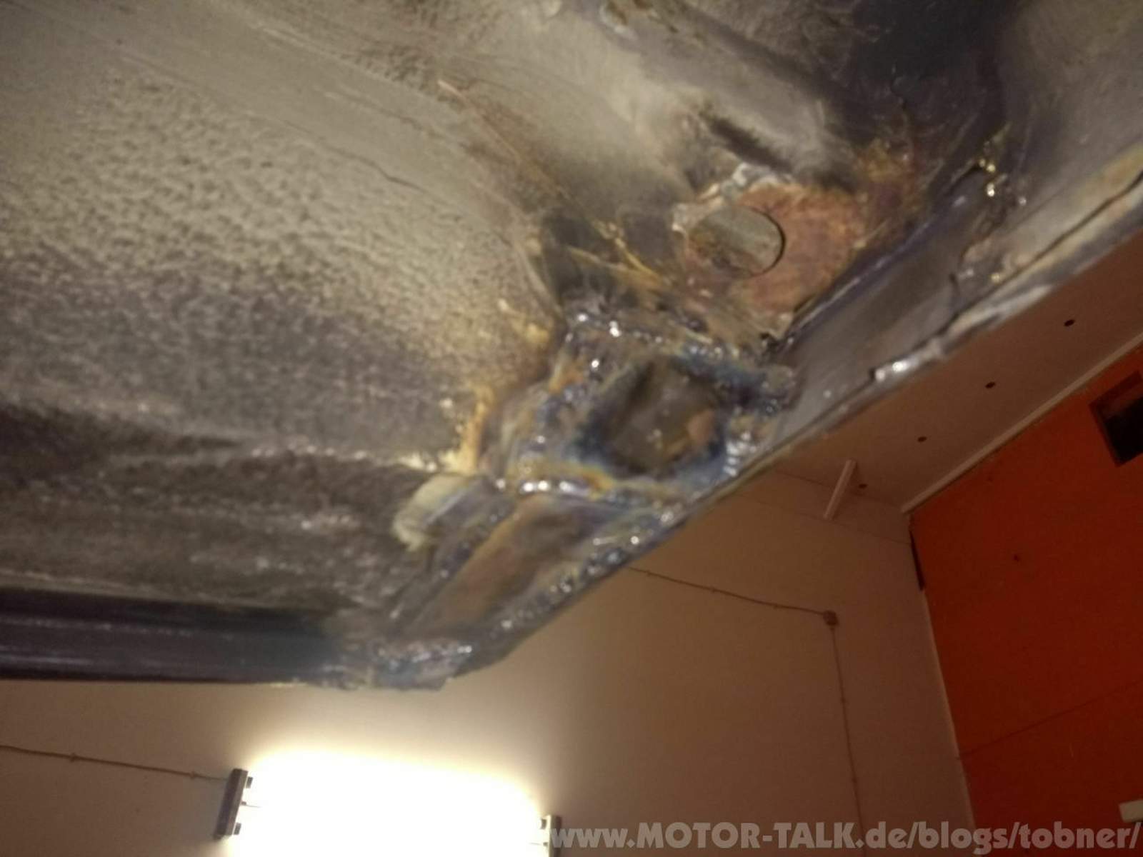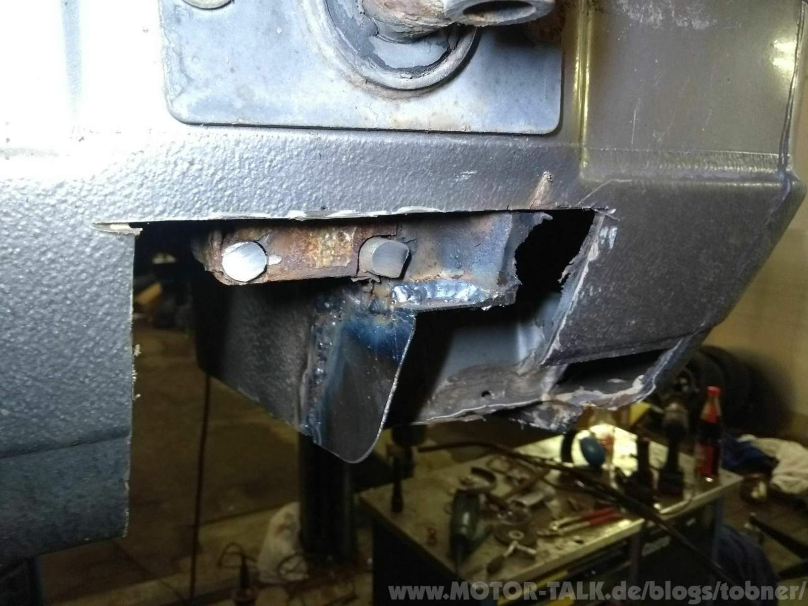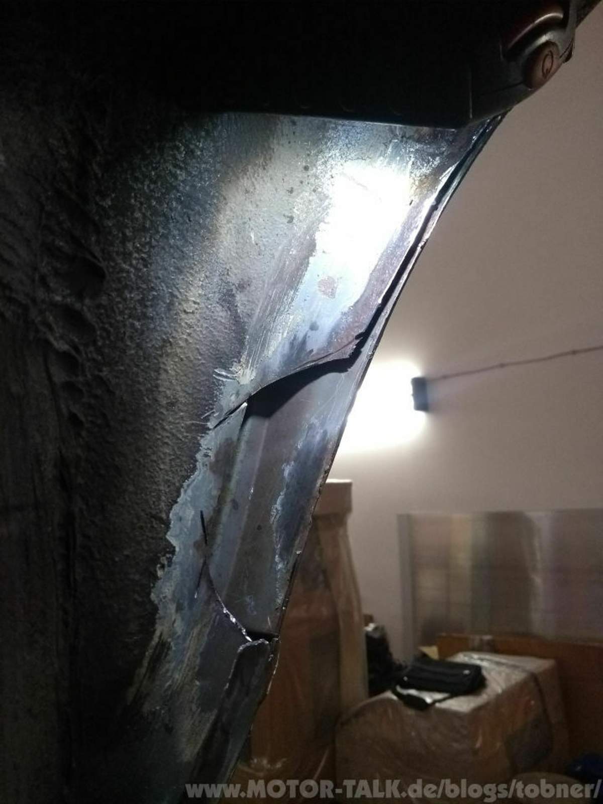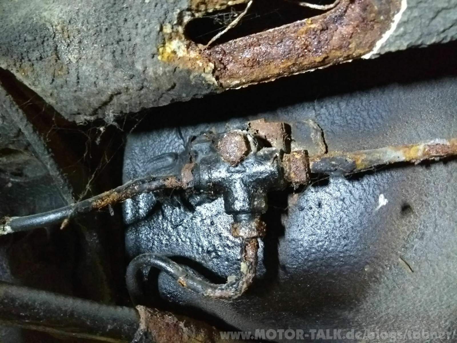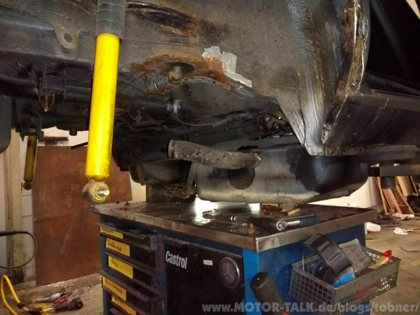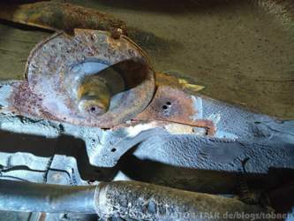 Erst die Achse raus, das ging recht easy. Nur die alten Tonnenlager waren in der Karosse festgekeimt und gingen nur mit roher Gewalt raus. Als die Achse draußen war, ging die Katastrophe los. Rost. Und hier und da etwas Rost. hinten war auch Rost. Und unten. Und am Tankrohr rostete es. Und Pfalzrost war auch zu sehen. Und Rostlöcher überall. Hatte ich schon vom Rost erzählt?!