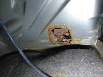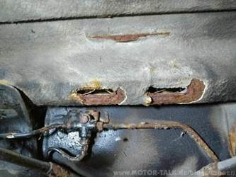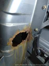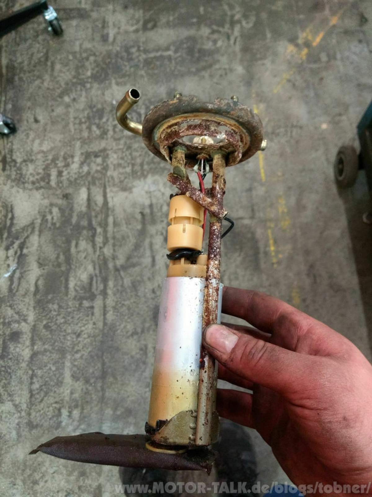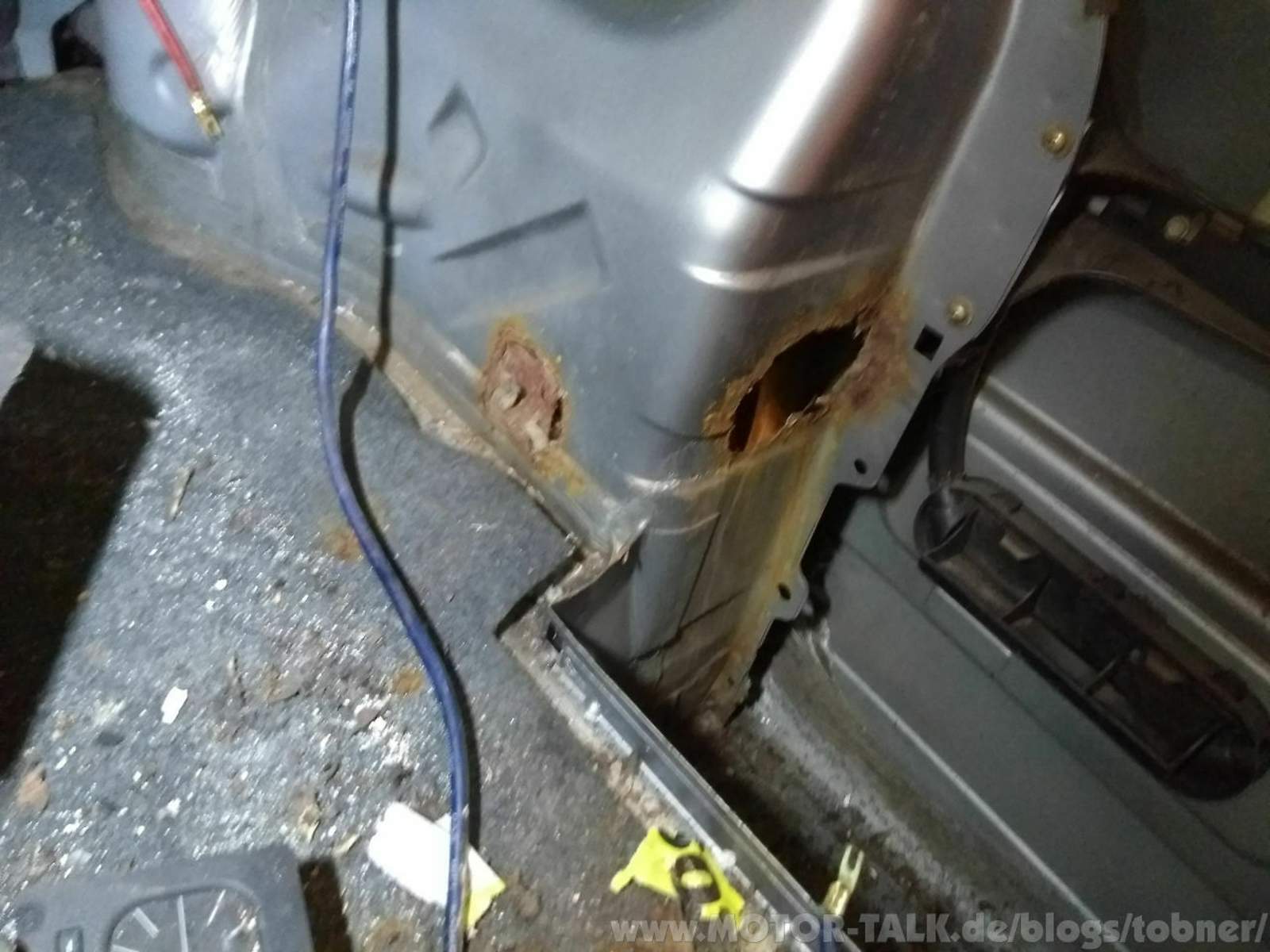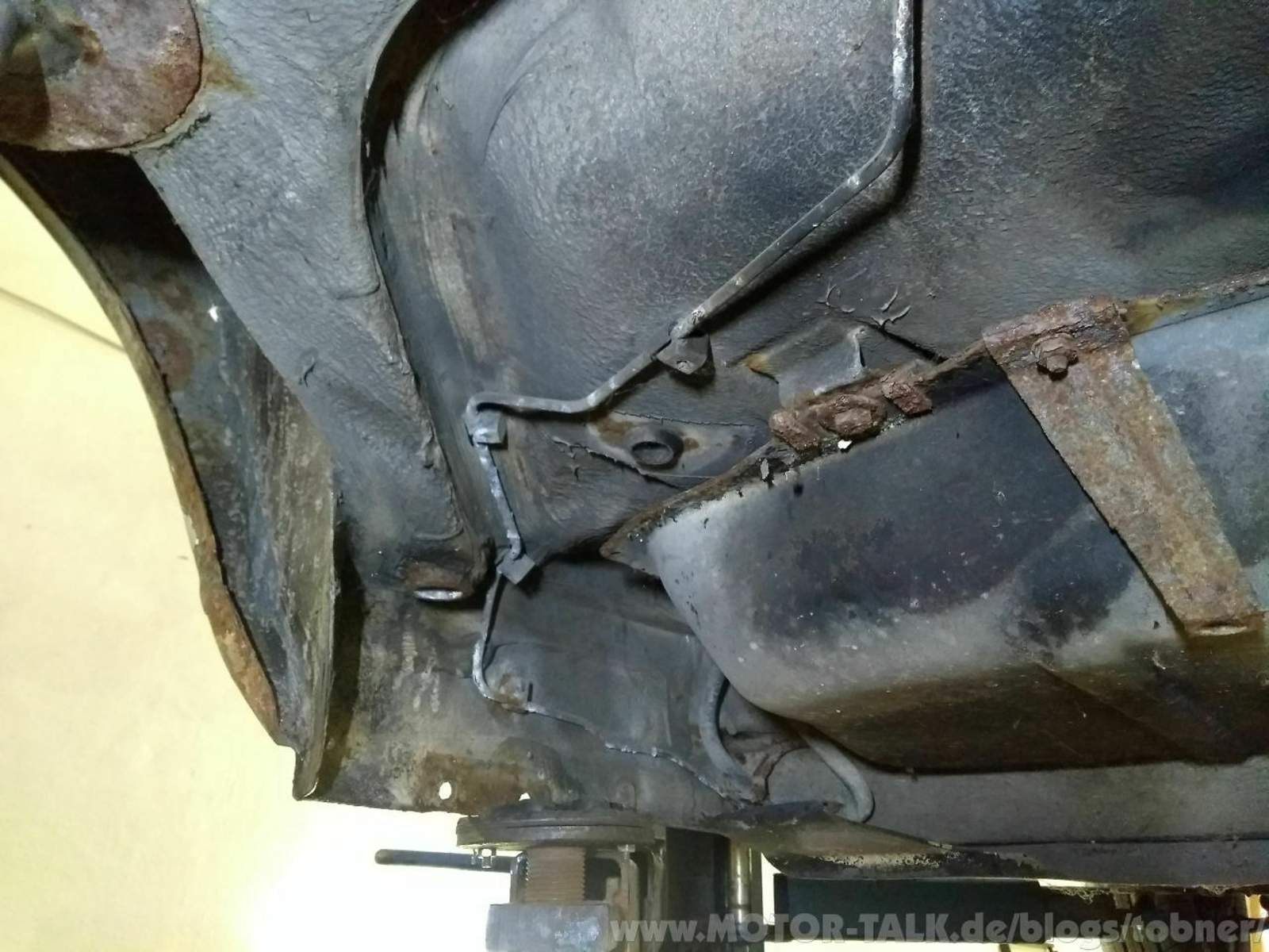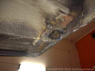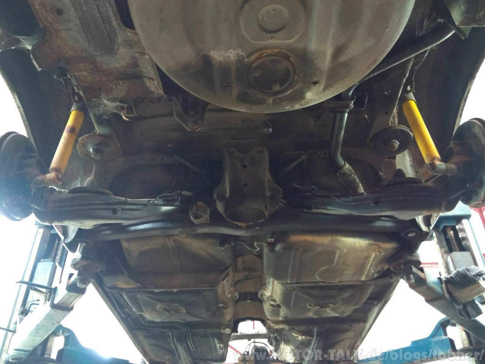 Erst die Achse raus, das ging recht easy. Nur die alten Tonnenlager waren in der Karosse festgekeimt und gingen nur mit roher Gewalt raus. Als die Achse draußen war, ging die Katastrophe los. Rost. Und hier und da etwas Rost. hinten war auch Rost. Und unten. Und am Tankrohr rostete es. Und Pfalzrost war auch zu sehen. Und Rostlöcher überall. Hatte ich schon vom Rost erzählt?!
