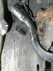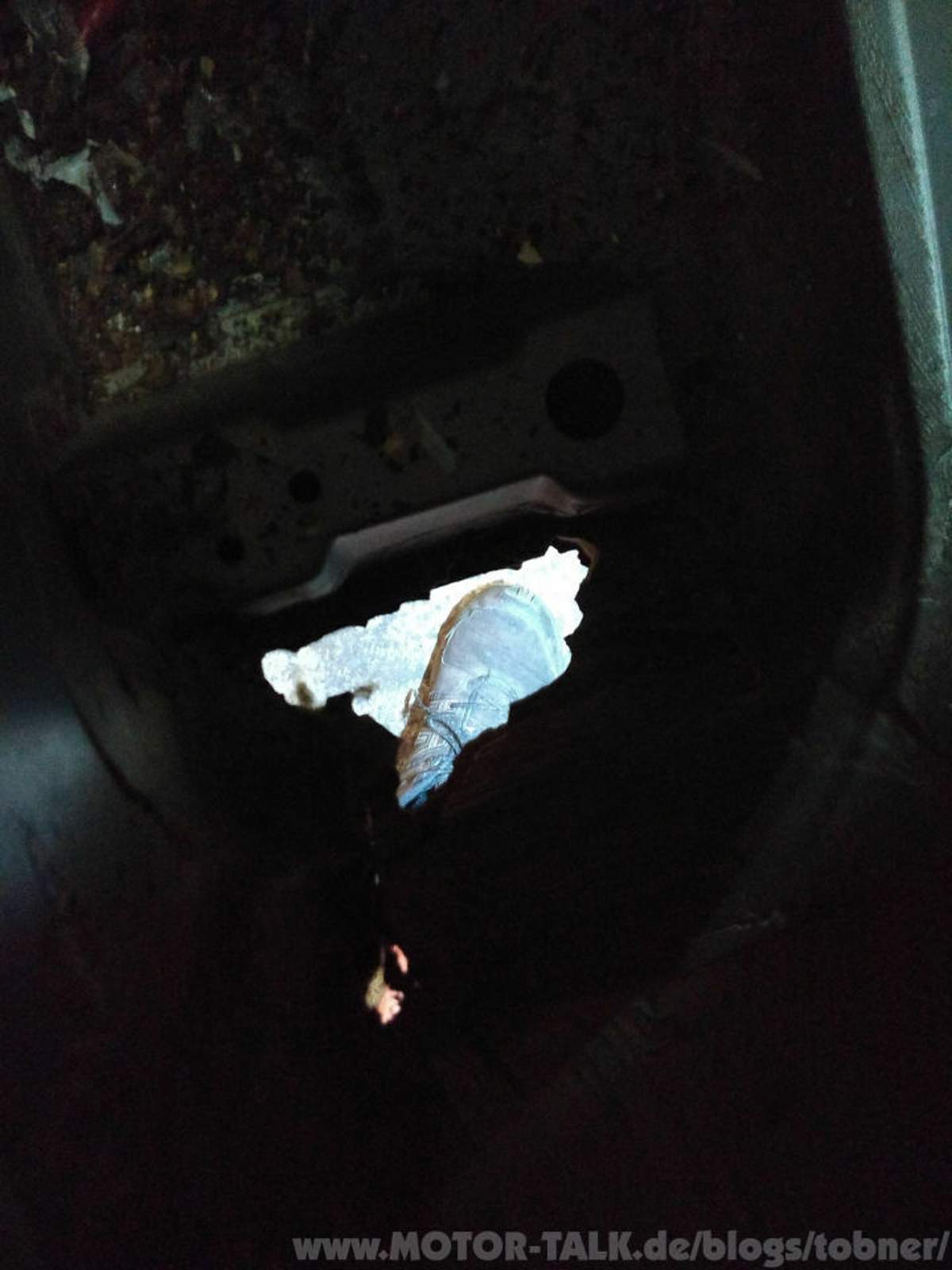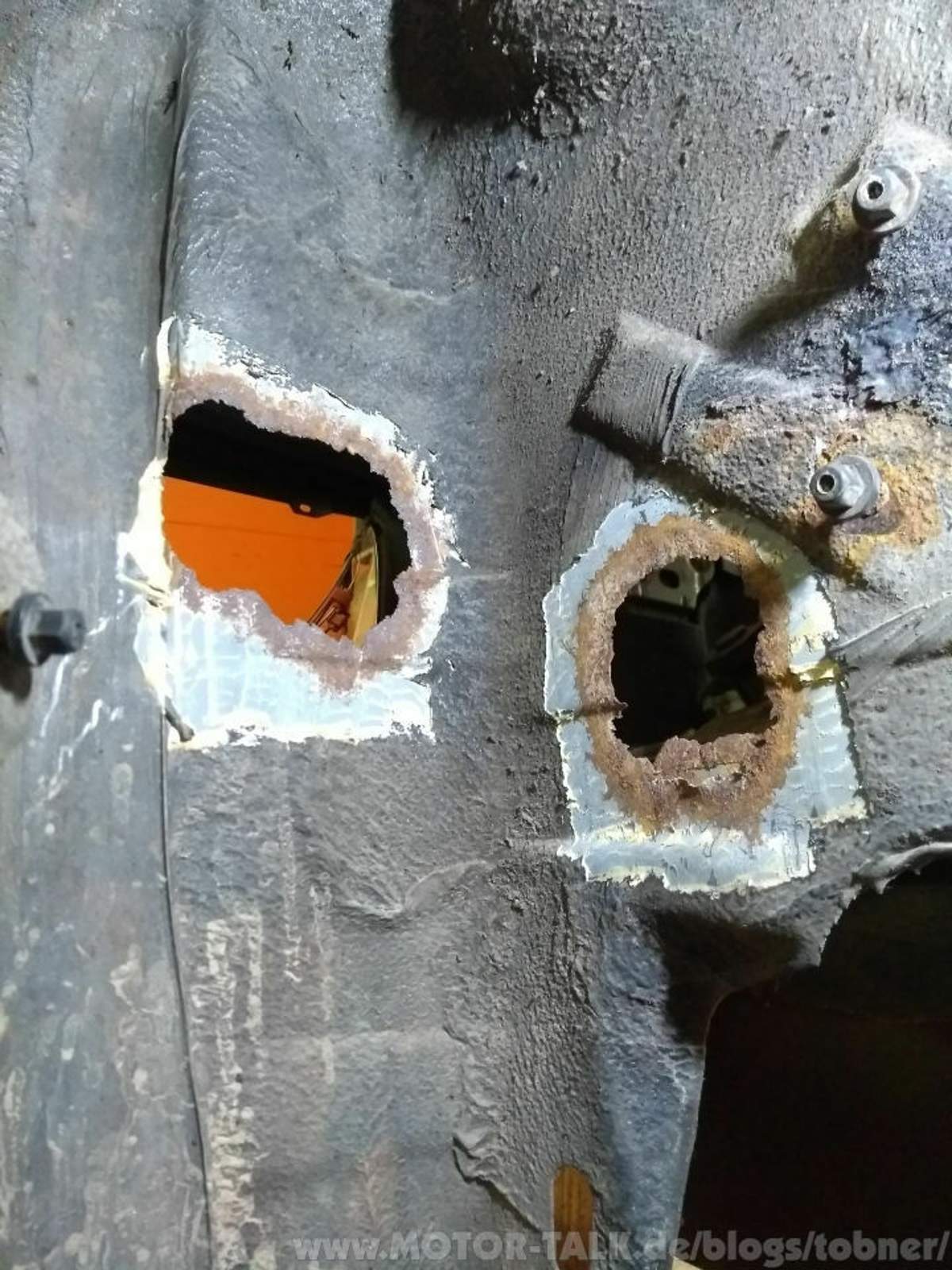 Der E30 hat eine ziemlich alberne Tankentlüftungskonstruktion. Es gehen mehrere Leitungen vom Tank durch ein Rohr zum rechten Radkasten, dort durch den gesamten Radkasten, hinter dem Stoßdämpfer entlang zum Tankeinfüllstutzen. Darüber sitzt noch ein Ausgleichsbehälter für die Tankentlüfung.Der Halter vom Tankrohr war weg. Hinter dem Tankrohr war ein Handflächengroßes Loch im Radhaus. Darum kümmerte ich mich als erstes.