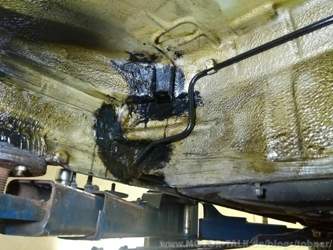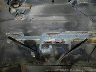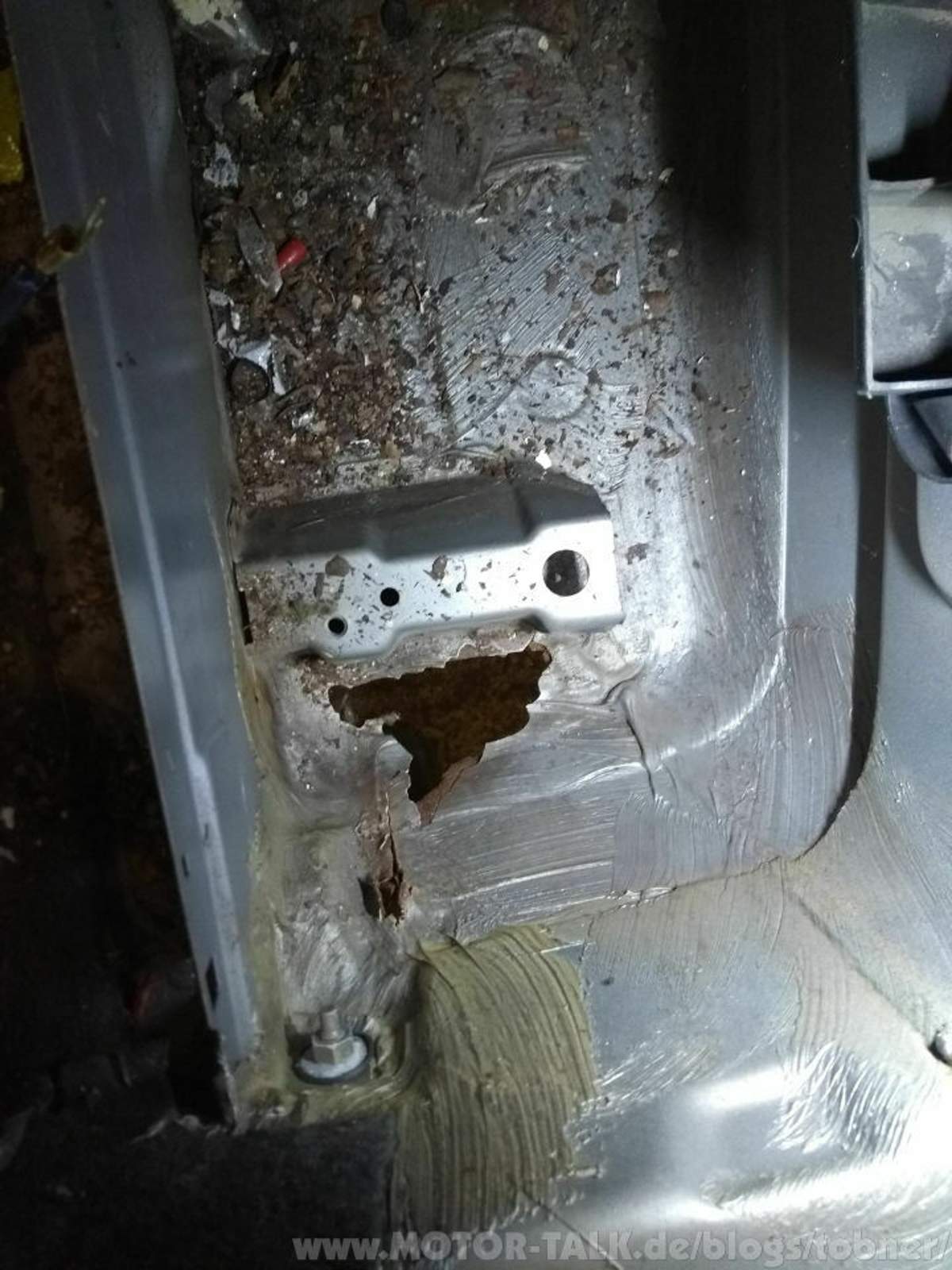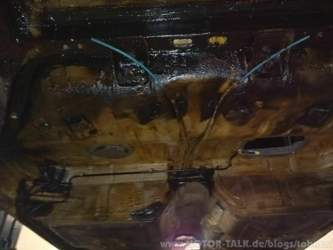 Danach befreite ich den Unterboden vom Auto von allen Kabeln, Sprit- und Bremsleitungen. Die Müssen eh alle neu. Anschließend suchte und stocherte ich den Unterboden ab und legte alle rostigen Stellen frei. Vorallem die Pfalze und Sicken sahen schlimm aus. An der Federtelleraufnahme war auch ein Loch drin.
