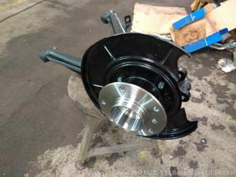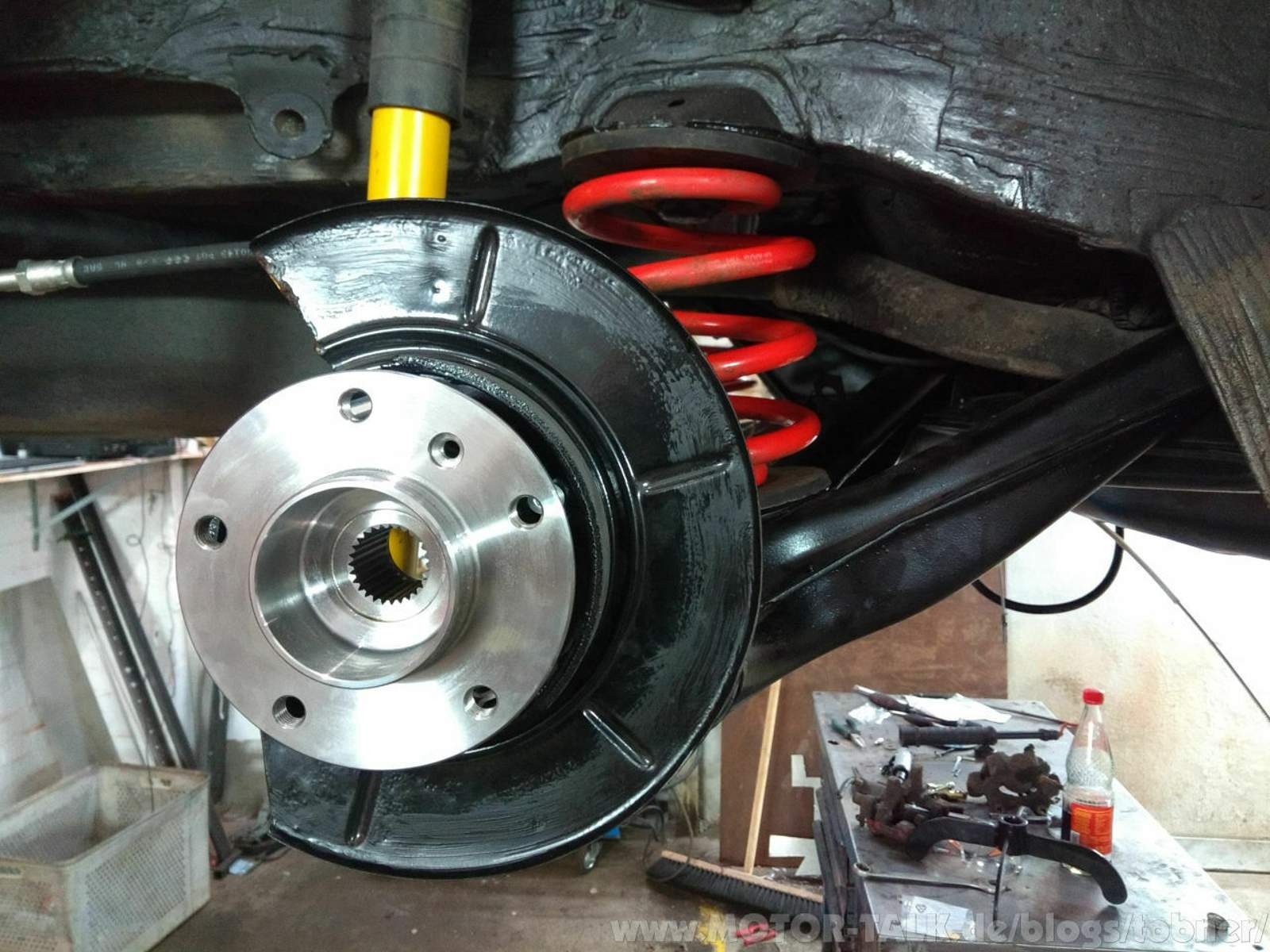 Der E30 hat hinten original eine Trommelbremse. Klar, für knapp 100PS reicht die, aber mit fast 300PS wäre sie dezent überfordert. Also muss eine Scheibenbremse her. Das geht bei BMW nur mit anderen Achsschwingen. Also Trommelbremsachse komplett raus und Scheibenbremsachse komplett rein. Die Achse, die ich organisiert hatte, habe ich sandstrahlen und mit Industrielack lackieren lassen. Anschließend habe ich neue Tonnenlager in den Achskörper und neue Schwingenlager in die Achsschwingen eingepresst. Dann habe ich neue E30-Radlager eingepresst und darin dann die Radnaben vom Z4. Das passt alles plug&play.