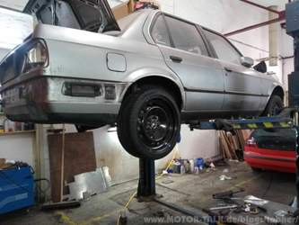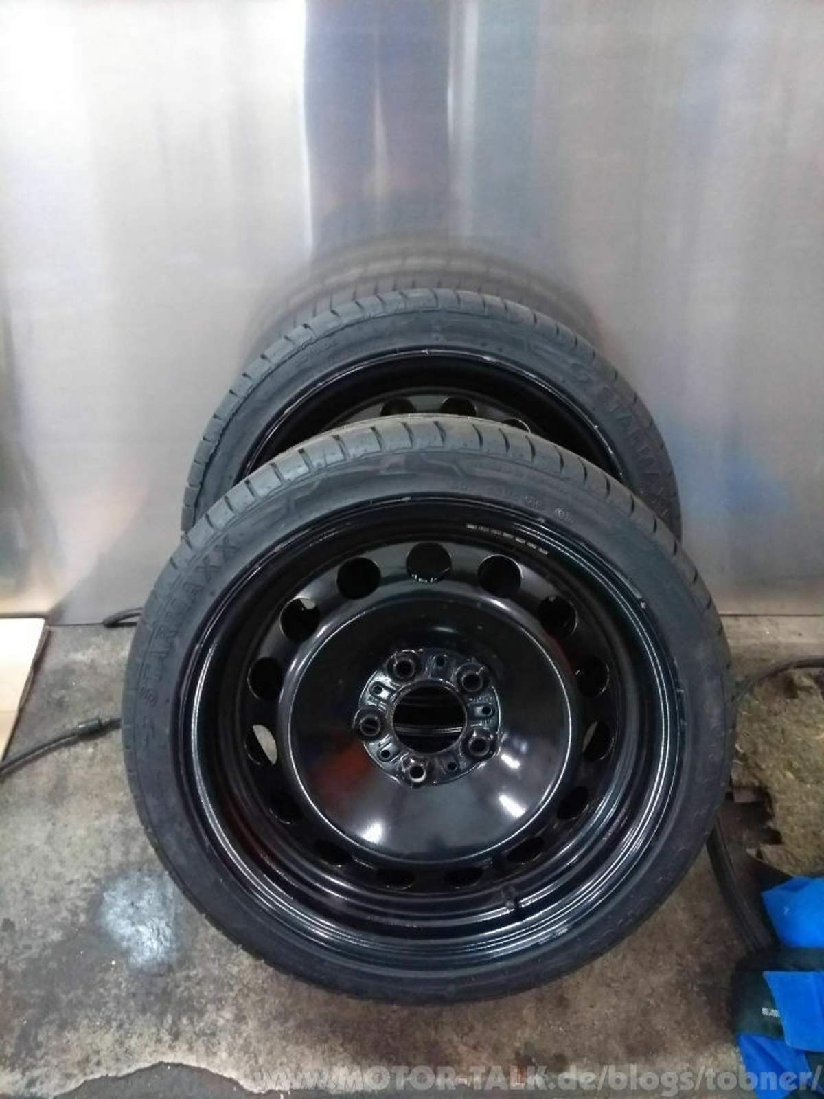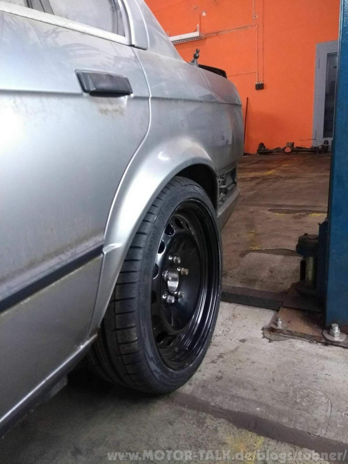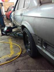 Ansonsten konnte ich den E30 auf die neue Achse stellen. Mitsamt den X1-Stahlfelgen in 17" mit neuen 215/40R17 Reifen. Macht schon einen gewaltigen Eindruck.