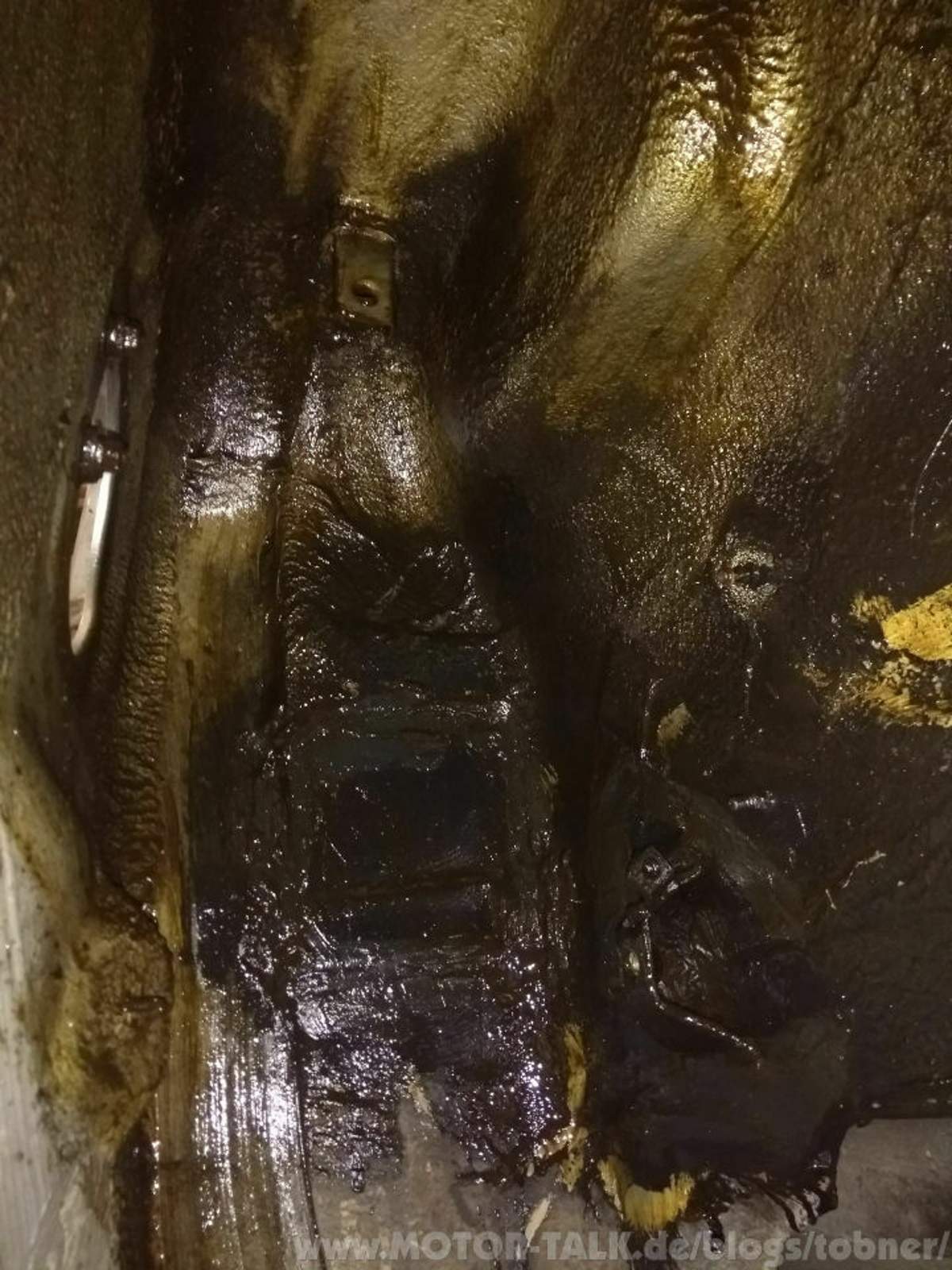Der Tank war innen fortgeschritten faulig. Ich überlegte, ob ich ihn vielleicht spühlen, reinigen, versiegeln, lackieren und wieder einbauen sollte?! Ich kaufte für 225Euro einen komplett neuen. Den Tank habe ich dann mit Brantho 3in1 Chassislack lackiert. Soll ja auch halten...