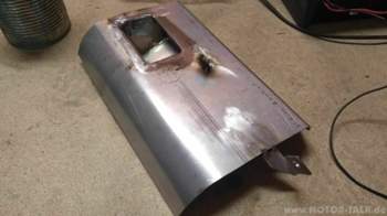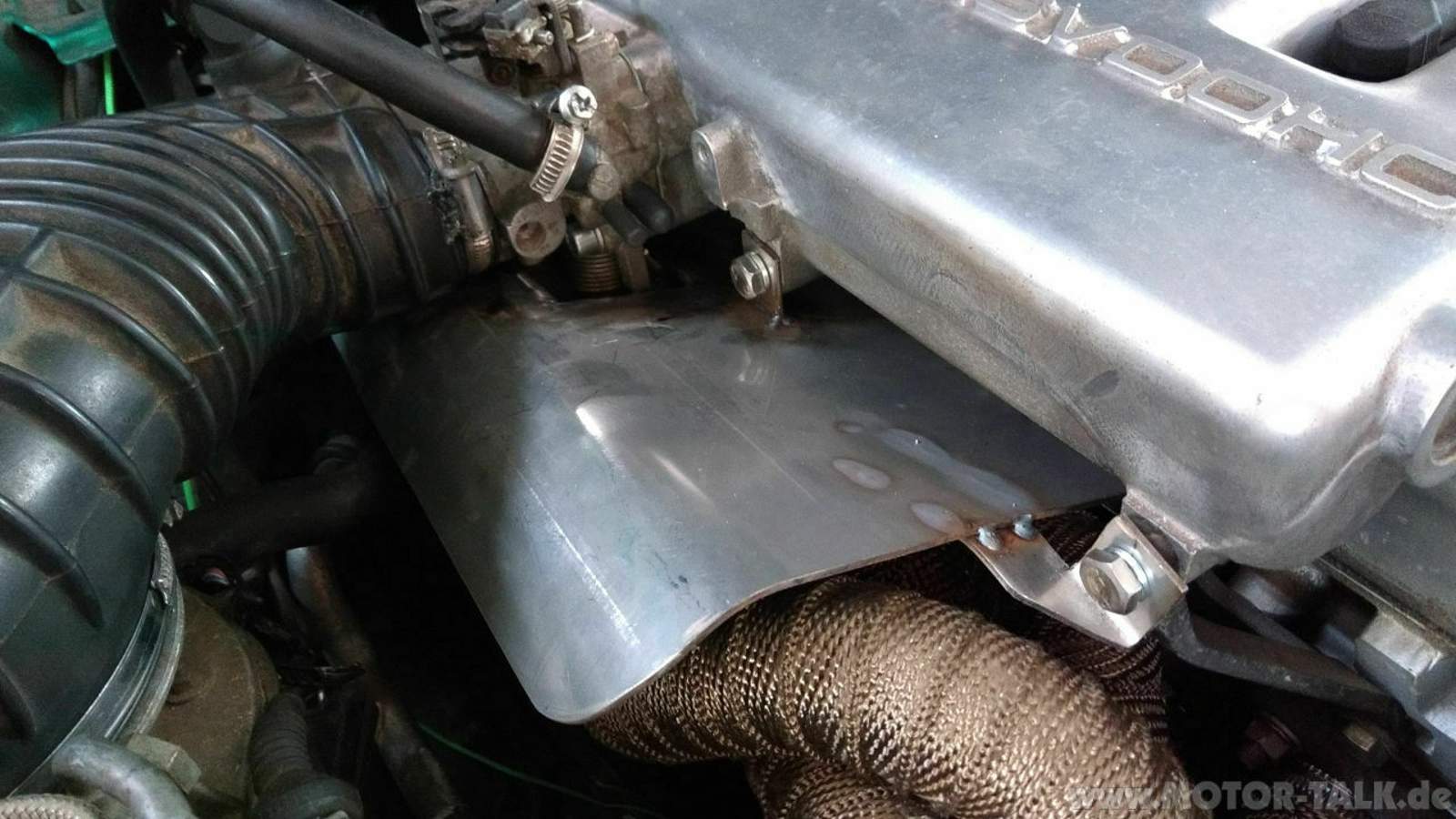 Ich habe mich also in die Halle gestellt und ein Edelstahlblech durecht geklempnert. Problematisch sind die Platzverhältnisse und die schwierige Form des Krümmers. Ich habe ein recht einfaches Blech gebaut und um die Achse der DK einen Kasten geschweißt. Sieht nicht sehr ansehnlich aus, funktioniert aber wie Sau.