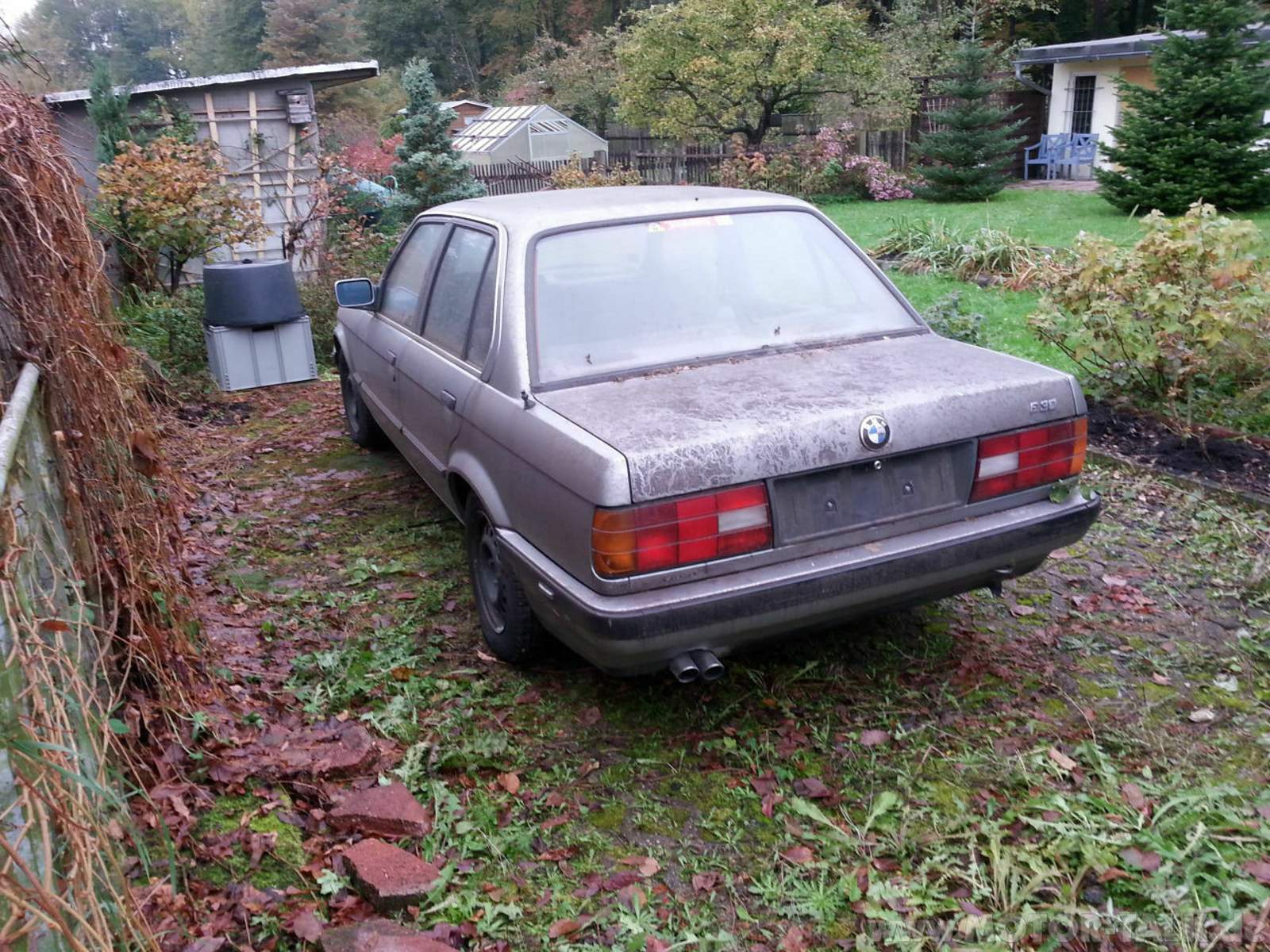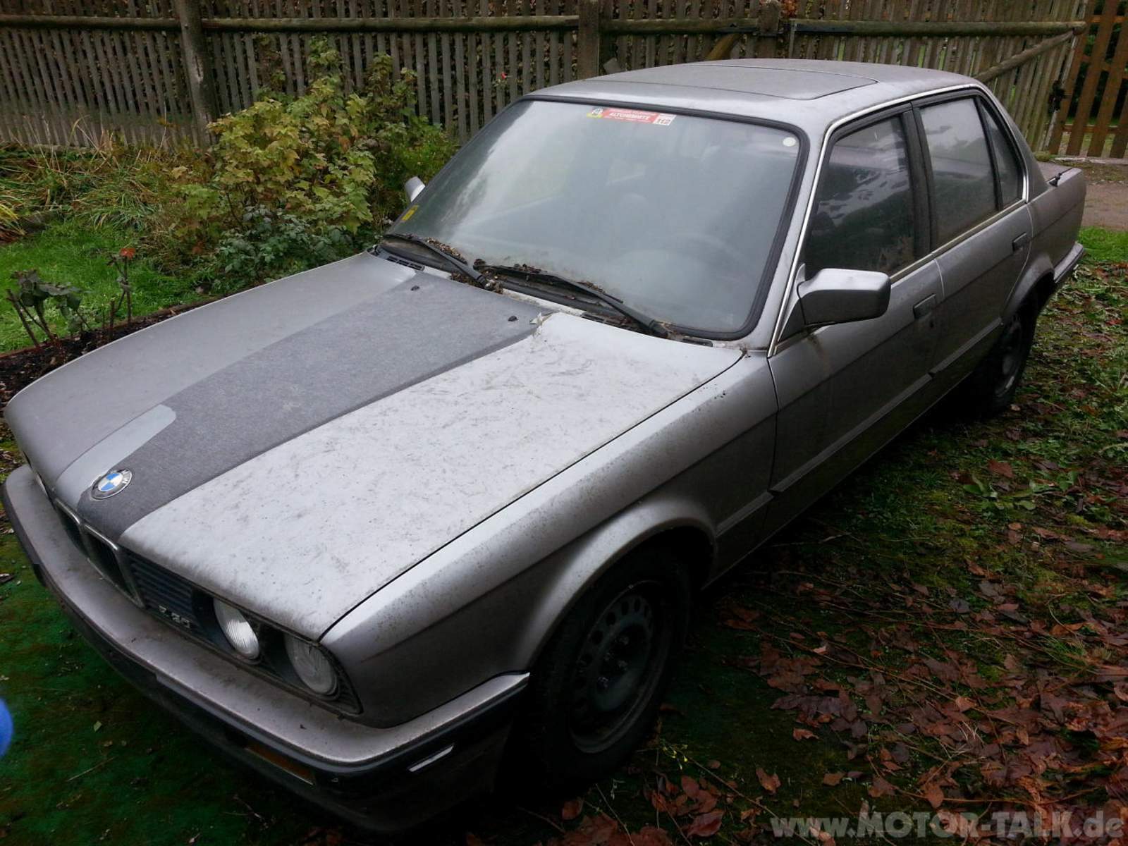 So stand er bei mir. Mein E30. Er stande 2 Jahre unter Bäumen, die Kiste sieht aus wie Sau. Egal, schickimicki kann man später immer noch machen, erstmal haben. Der Zustand war wirklich erste Sahne. Bis auf eine kleine, etwas rostende Delle im Radlauf HR war wirklich nichts zu beanstanden. Keine Kratzer, keine Beulen, kein Rost. Wahnsinn. Auch innen alles schick. Es roch etwas modrig, irgendwo schien Wasser eingetrungen zu sein, aber das stempel ich als "Kleinigkeit" ab. Ausstattung ist etwas dürftig. Schiebedach... Ja, das wars auch schon. Der Motor ist ein 1,6er mit 10xPS, daran hängt auch noch ein Automatikgetriebe. Bin ihn ja nicht gefahren, aber ich kann mir vorstellen, dass man mit dem Mofa schneller ums Eck kommt