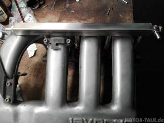 Ihr seht, es passt nicht so leicht zusammen, mein Puzzle... Fortsetzung folgt dann im Laufenden Betrieb, kommen wir zu den Arbeiten, die mich wieder viele Nerven, Muskelkater und Blutblasen gekostet haben Angefangen habe ich mit den leichten Sachen, sozusagen den Amateurarbeiten An die Ansaugbrücke habe ich mal die Epytec-Einspritzleiste gehalten. Wie auf den Bildern zu erkennen ist, passt nichts. Die Befestigungslaschen sind völlig falsch positioniert. Das liegt aber am Saugrohr, nicht am Hersteller.