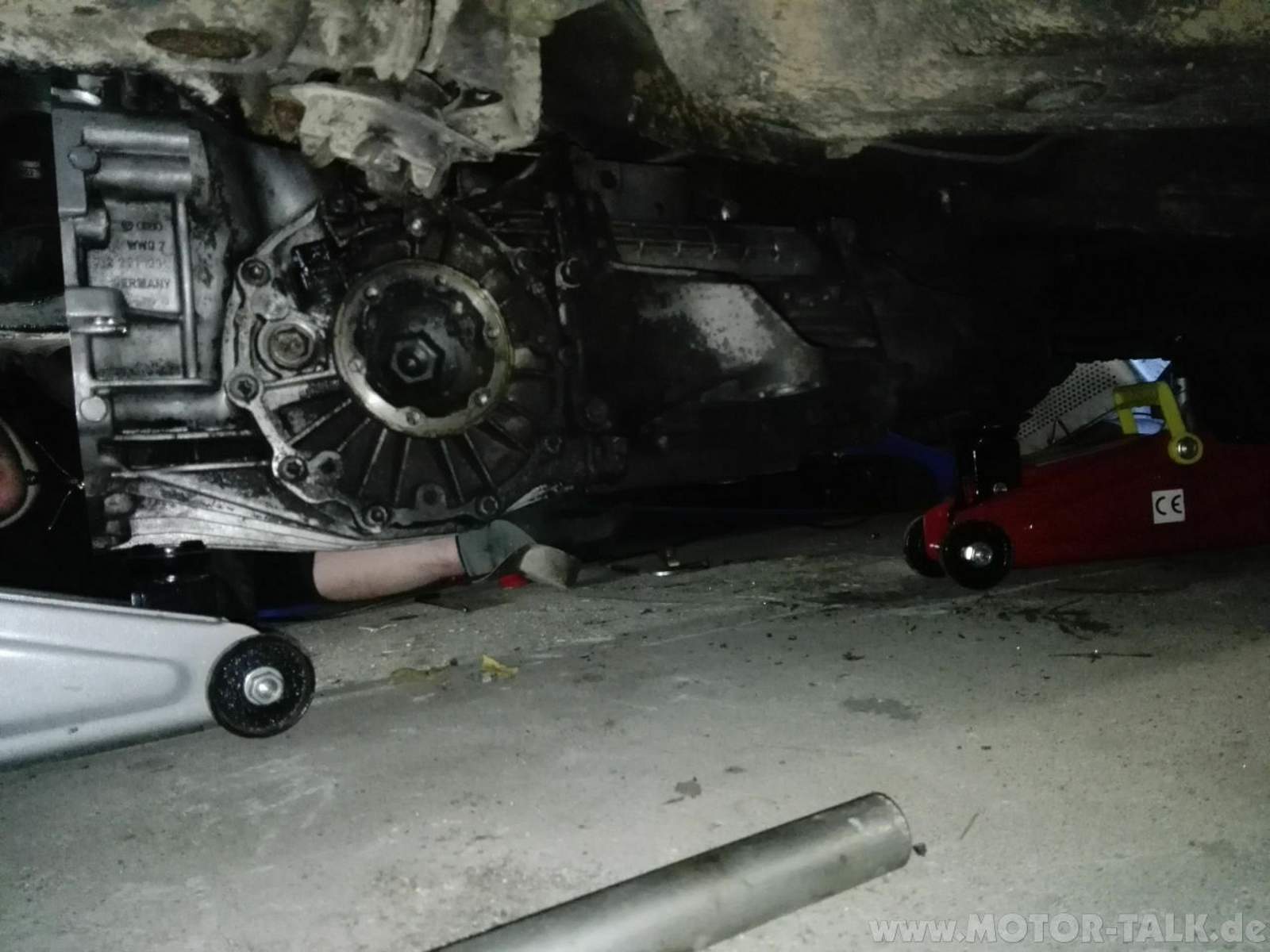 Danach habe ich ein Opfer meiner Wahl zu mir bestellt, das mir helfen sollte, das Getriebe wieder einzubauen. Nachdem das Getriebe wieder unter dem Auto lag (wir hatten es auf einer Holzplatte herumgerutscht), haben wir 2 Rangierwagenheber unter das Getriebe gestellt, den Nehmerzylinder angebaut, der eine saublöde Position an der Oberseite des Getriebes hat und die Hochzeit vorbereitet. Es war eine Katastrophe. Problem war, dass bei Audi das Lenkgetriebe an der Stehwand hinter dem Motor verbaut ist und 15cm in den Motorraum ragt. Man muss mit der Kupplungsglocke darunter "durchtauchen", weil die Oberkannte der Getriebeglocke noch über dem Lenkgetriebe ist. Das geht aber nicht, weil die Getriebewelle schon an der Kupplung anstößt. Ich hab nach einer Stunde kurz geweint, dann den Motor so weit es ging nach hinten gekippt und das Getriebe schräg von unten herangefädelt. Das ging aber auch nicht, weil links und rechts 2 Halter am Getriebe sind, die ÜBER den Hilfsrahmen müssen, der unter dem Auto hängt. Es war zum verzweifeln. Nach einem kurzen Ausbruch der Ungeduld hatte es sich zwischen Hilfrahmen, Lenkgetriebe und Kupplung so verklemmt, dass wirklich überhaupt nichts mehr ging. Es war Zeit für Feierabend.