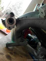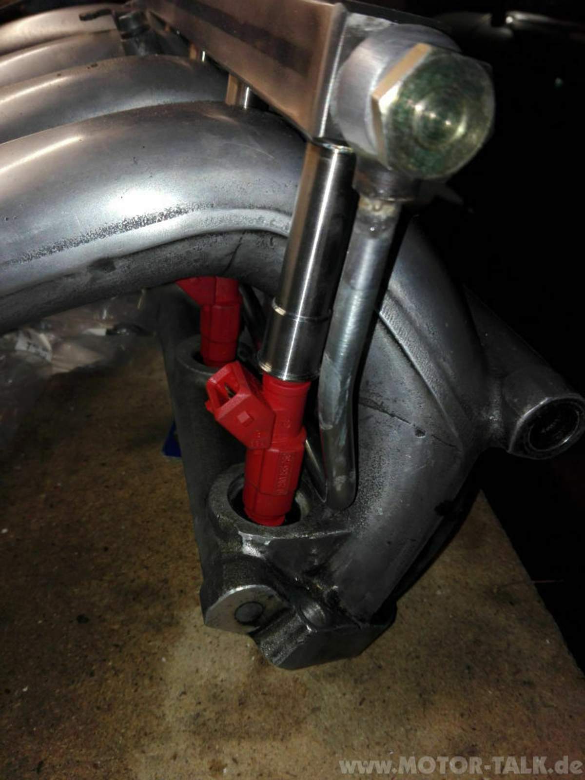 Die Ansaugbrücke habe ich samt Einspritzventilen zu Epytec geschickt, dort wurde eine spezielle Einspritzleiste gefertigt. An diese wurde dann die Rücklaufleitung aus Edelstahlrohr gezaubert. Dazu wurde auf eine Ringöse die Leitung gelötet und passend gebogen. Der Rücklauf geht jetzt zwischen den Saugrohren und den Einspritzventilen nach hinten. Dort wird dann ein Schlauch angeschlossen, der zum einstellbaren Benzindruckregler geht.