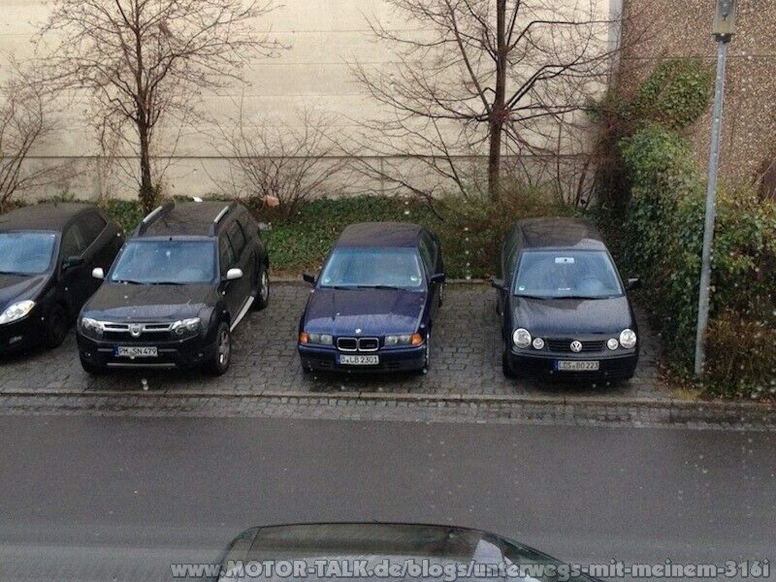 Nun ging die Suche nach einen neuen Auto los. Ich hatte keine Idee, was es werden könnte. Irgendwann fuhr ich mit Vaddern durch die Stadt und da stand ein alter BMW mit Verkaufsschild am Straßenrand. Damals war ich von BMW schon voll angefixt, aber die Vorurteile hatten bestand: Teure Anschaffung, teurer Unterhalt, hoher Spritverbrauch - eigentlich nicht bezahlbar. Angehalten haben wir dennoch und standen vor einem 318i Touring der Baureihe E30 in Lagunengrün. Die Ausstattung bot mir Zentralverriegelung und KLIMAANLAGE Dinge, von denen ich beim Polo nicht zu träumen wagte. Und das Auto sollte auch nur 2.500€ kosten. Dass BMW überhaupt so wenig kosten können!? Dagegen standen 12 Jahre und abgelesene 194tkm. Für mich damals mehr als ich jedem Auto zugetraut hätte. Der Verkäufer schien aber seriös und berichtete von einer kürzlich getauschten Nockenwelle, einem abgedichteten Lenkgetriebe, frischem TÜV und auch sonst einem guten Zustand. Eine Nacht und etliche Ouzo später war die Entscheidung klar: Was konnte ich nach dem Reinfall mit dem teuren Jungwagen ohne Ausstattung schon verlieren? Dat Ding wird gekauft! Das wurde es auch und der 3er begleitete mich 2 wunderbare Jahre. Bis auf einen schwergängigen Bremssattel gab es keine Probleme, das Auto fuhr wie ein Bienchen und der E30-Stammtisch betätigte für den als Elektrotacker verschriehenen M40-Motor eine seltenste Laufruhe. Leider habe ich das Fahrzeug nach 2 Jahren aus Gründen abgegeben, die aus heutiger Sicht absolut vermeidbar waren. Das ärgert mich heute noch!