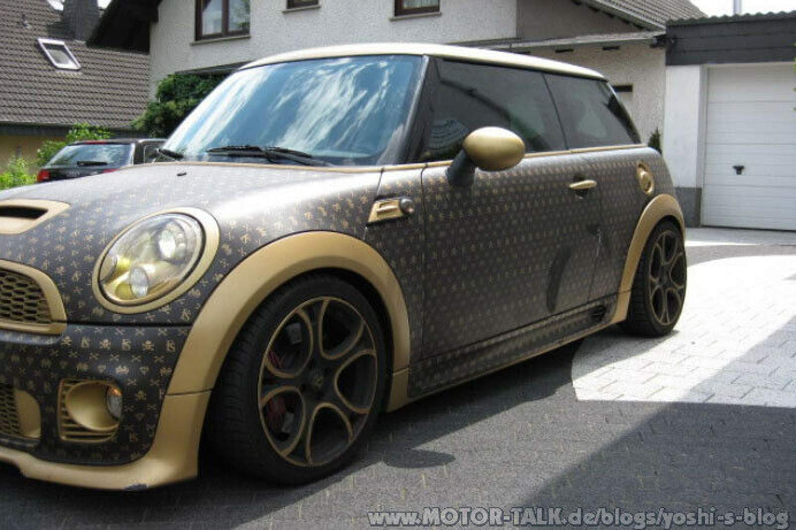Vor zwei Jahren wurde der Mini JohnCooper Works von Folierungs-Spezialist CoverEFX auf die Menschheit losgelassen. Um Urheberrechtsverletzungen aus dem Weg zu gehen wurde das Logo-Print der Edel-Marke natürlich verändert. Wer genau hinschaut erkennt Totenköpfe, gekreuzte Knochen und Ziel-Flaggen. Über die dunkle Leder-Look Folie mit Oberflächenprägung wurden die tausenden goldenen Kleinmuster einzeln per Hand aufgeklebt. An den gespalteten Meinungen zu diesem Look, hat sich aber damals wie heute nichts geändert. Von Himmelhoch-Jauchzen (meist von Taschen-Liebhaberinnen) bis hin zum Naserümpfen (eingefleischter Mini-Fans) war und ist eigentlich alles dabei.