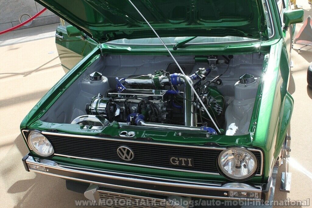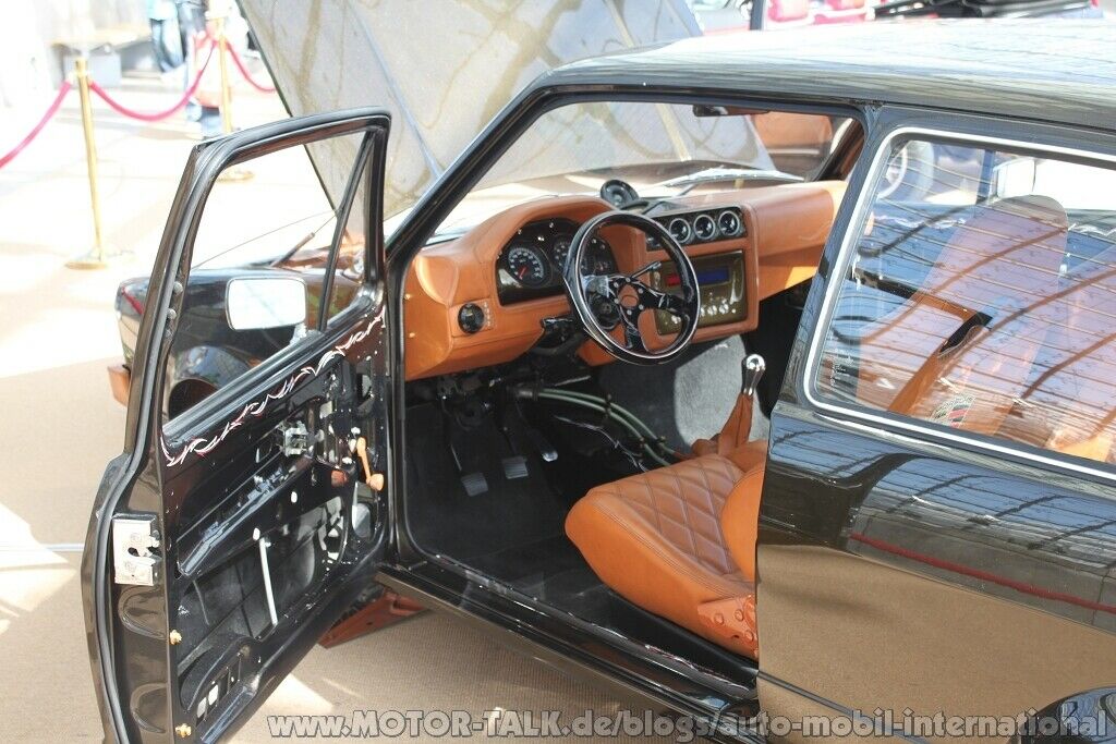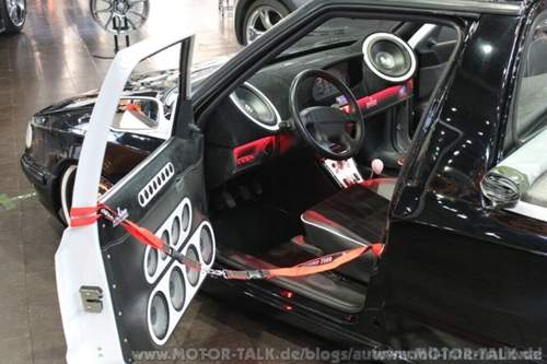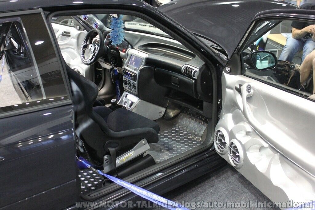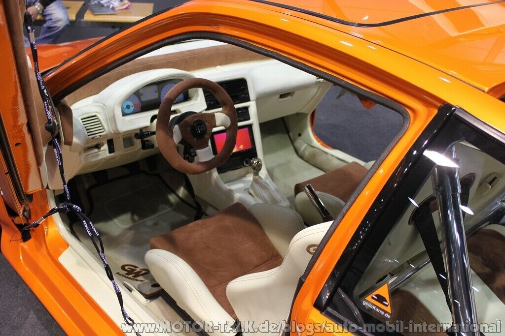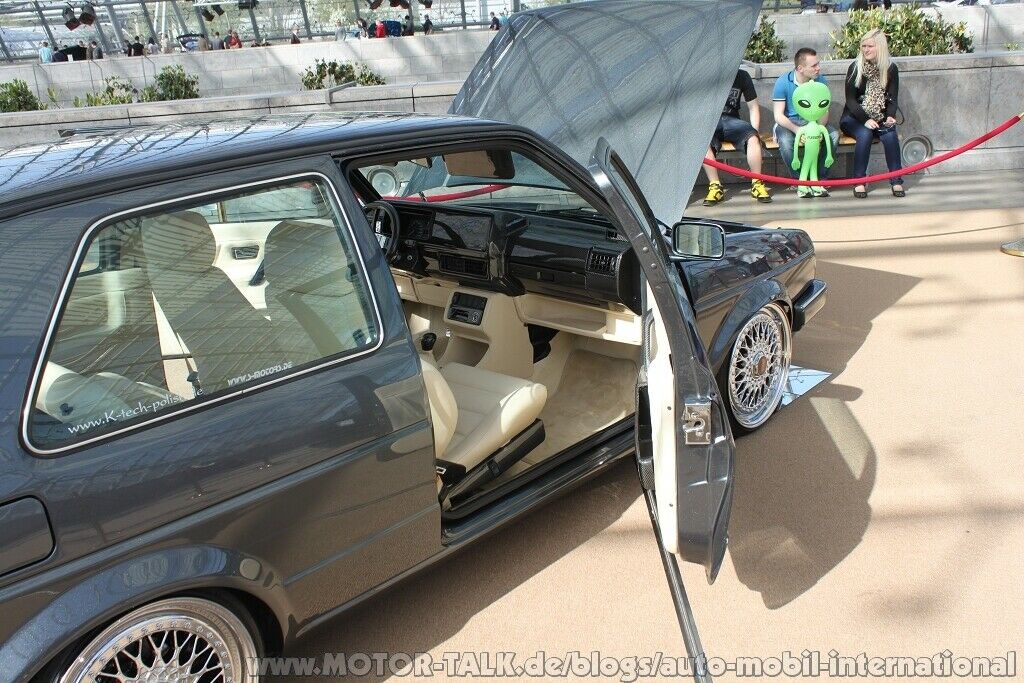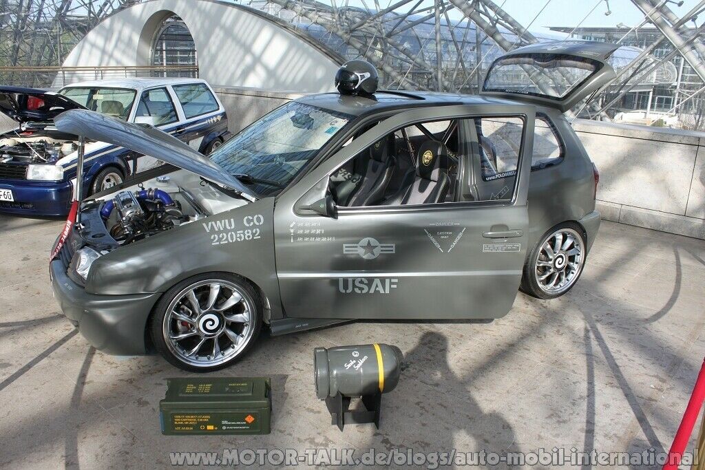 Schönste Motorräume Ausgestellt waren diverse Fahrzeuge, bei denen das Hauptaugenmerk auf dem Motorraum lag. Chrom, Gold, Lack und Leder sind hier nicht neu in der Szene, wurden dort aber nochmal auf eindrucksvolle Weise ausgestellt. Viele der Autos waren bis zur Unkenntlichkeit verspoilert und trafen dadurch absolut nicht meinen Geschmack, es waren jedoch einige Schmuckstücke vorhanden: Besonders der Polo aus dem letzten Bild hat es mir angetan. Das Motto war offensichtlich "Kampfjet": Neben einer matt-oliven Lackierung und Turbinenfelgen war das ganze Cockpit eines aktuellen Honda Civic installiert.