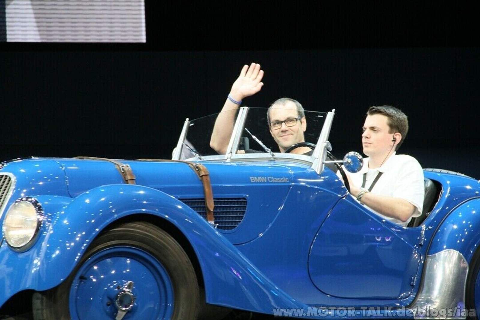 Abfahrt von der Bühne im BMW 328 Während der Bühnenshow hatte auch ein MOTOR-TALKer das Glück (ja, er wollte es!), zum Moderator auf die Bühne geholt zu werden und per Frage- und Antwortspielchen die "für ihn passende Design-Linie des 1ers“ auszuwählen. Als krönender Abschluss der Bühnenshow wurde er dann im 75 Jahre alten BMW 328, dem Traumsportwagen von anno dazumal, von der Bühne gefahren.