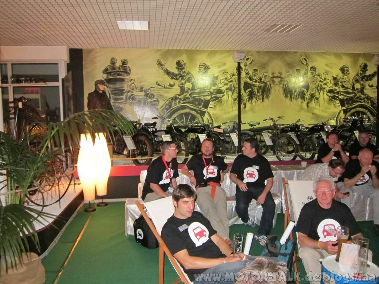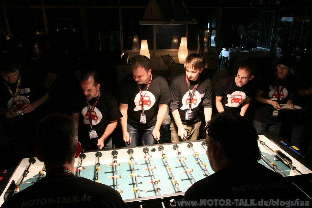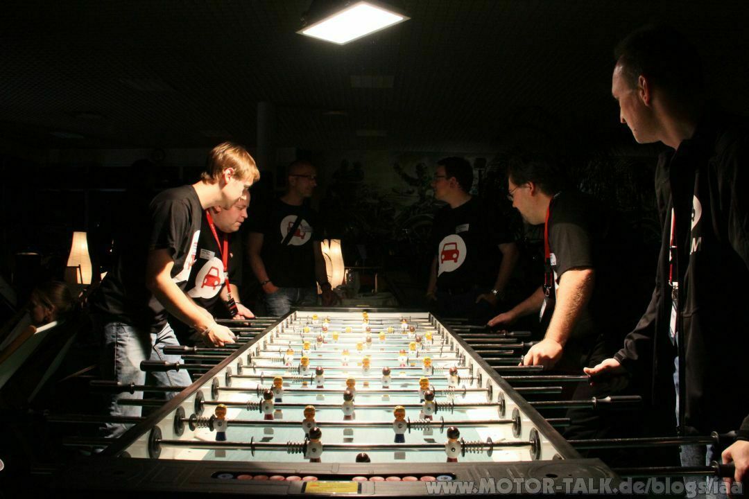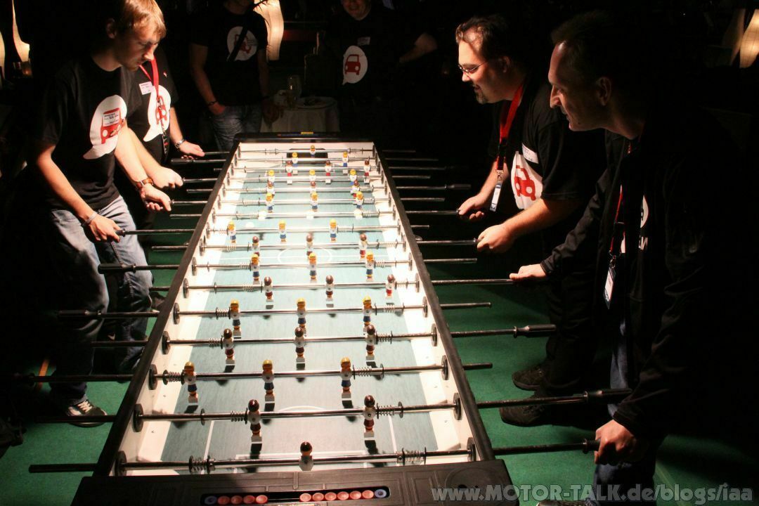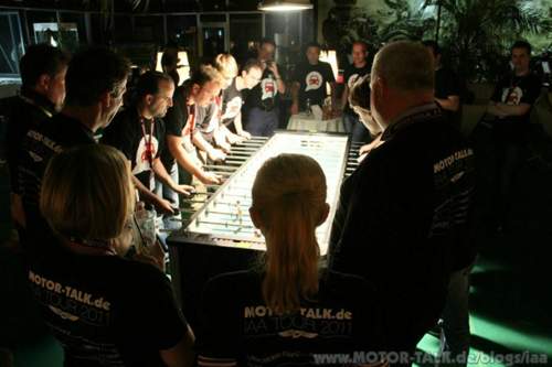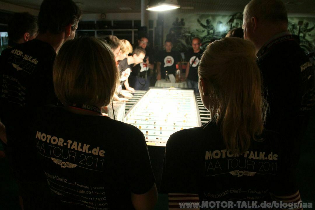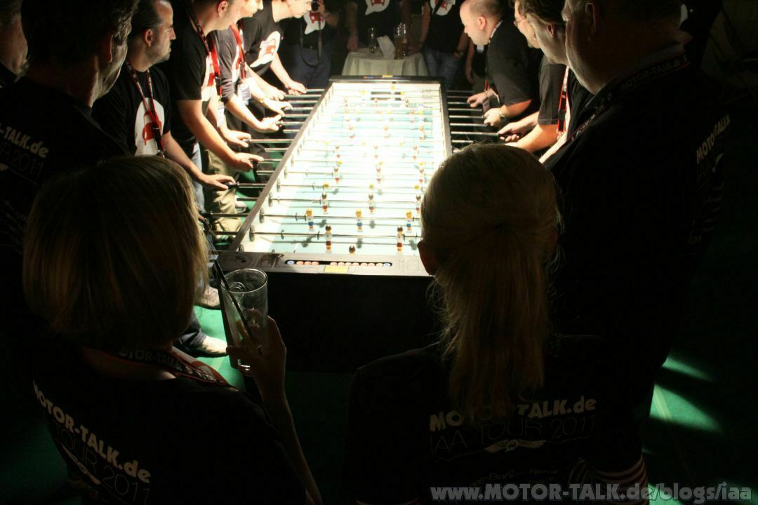 Eine IAA-Tour ohne Abschlussfeier ist vielleicht eine IAA-Tour, aber keine MOTOR-TALK IAA Tour! Und der Ort des Geschehens passte zu MOTOR-TALK wie die Faust aufs Auge. „Hier riecht es komisch … irgendwie nach Motorenöl oder so“ war denn auch der erste Kommentar so einiger MOTOR-TALKer, die nach bewältigter IAA-Tour das Oldtimerstübchen betraten. Da muss man eben durch, wenn man mitten in einem technischen Museum abchillen will. Auch wenn es mit grünen Teppichen und Strand-Liegestühlen ausstaffiert ist und außerdem mit Lounge-Musik beschallt wird. Und mal ehrlich, wer Benzin im Blut hat, den kann doch etwas Motoröl in der Nase nicht stoppen, oder? Einige Hartgesottene bekamen auch tatsächlich nicht genug von Karosserien und Motoren und besichtigten mit wechselnder Gründlichkeit die ausgestellten Exponate - darunter eine der wichtigsten Sammlungen historischer Motorräder in Deutschland. Die meisten machten es aber wie Admin Bert und widmeten sich zunächst mal vorrangig der Entspannung. Aber auch wer sich eisenhart an Mineralwasser und Salat hielt glaubte, doppelt zu sehen: In der Mitte des Raums stand ein Kickertisch mit unglaublich vielen Stangen pro Seite. Hier spielt man in Viererteams gegeneinander, was nach den unvermeidlichen organisatorischen Anlaufschwierigkeiten so einer Massenveranstaltung auch gern angenommen wurde. Aber je später der Abend, desto … bessere Ideen kriegen manche Leute: Auf einmal stand ein Match „Werkstatt gegen Moderatoren“ im Raum. Die Herausforderung wurde angenommen, möglichst demütigende Wetteinsätze wurden gefordert. Mit Rückendeckung von MOTOR-TALK Gründer habu einigte man sich: Gewinnen die Moderatoren, wird MOTOR-TALK sichtbare Folgen davontragen. Gewinnt die Werkstatt, trifft es die Moderatoren. Gewissenhaft versuchten beide Gruppen, ihre stärkste Mannschaft ins Feld zu schicken. Allerdings hatten wir im Vorfeld schon festgestellt, dass der Kickertisch ein Gefälle aufwies: Spielt man Richtung Motorradsammlung, geht fast jeder Ball ins Tor; spielt man dagegen Richtung Toilette, hat man eher schlechte Karten. So gesehen erwartungsgemäß (wenn auch nicht ganz unverdient Natürlich mussten auch die belastbarsten IAA-Tourer irgendwann ins Bett. Und dorthin verschwanden dann auch alle irgendwann, wie man so sagt: Groggy, aber glücklich Lest auch hier unseren Auftaktartikel zur IAA Tour. Lest auch hier unseren Artikel zum Mercedes-Benz Standbesuch um 10 Uhr Lest auch hier unseren Artikel zum Ford Standbesuch um 12 Uhr Lest auch hier unseren Artikel zum BMW Standbesuch um 14 Uhr Lest auch hier unseren Artikel zum Volkswagen Standbesuch um 16 Uhr Lest auch hier unseren Artikel zum Audi Standbesuch um 18 Uhr |