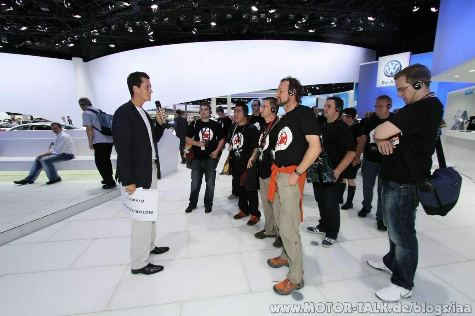Auch bei VW wurden die MOTOR-TALKer auf verschiedene Gruppen aufgeteilt, die dann von „verkabelten“ Guides über den Stand geführt und an verschiedenen Stationen über Wissenswertes aus dem Hause Volkswagen informiert wurden. Im Zentrum des allgemeinen Interesses: Die Neuheiten up! und Beetle. Beide Modelle wurden in mehreren Exemplaren auf einer großen, speziell designten Fläche präsentiert, der up! Area und dem Beetle Club.