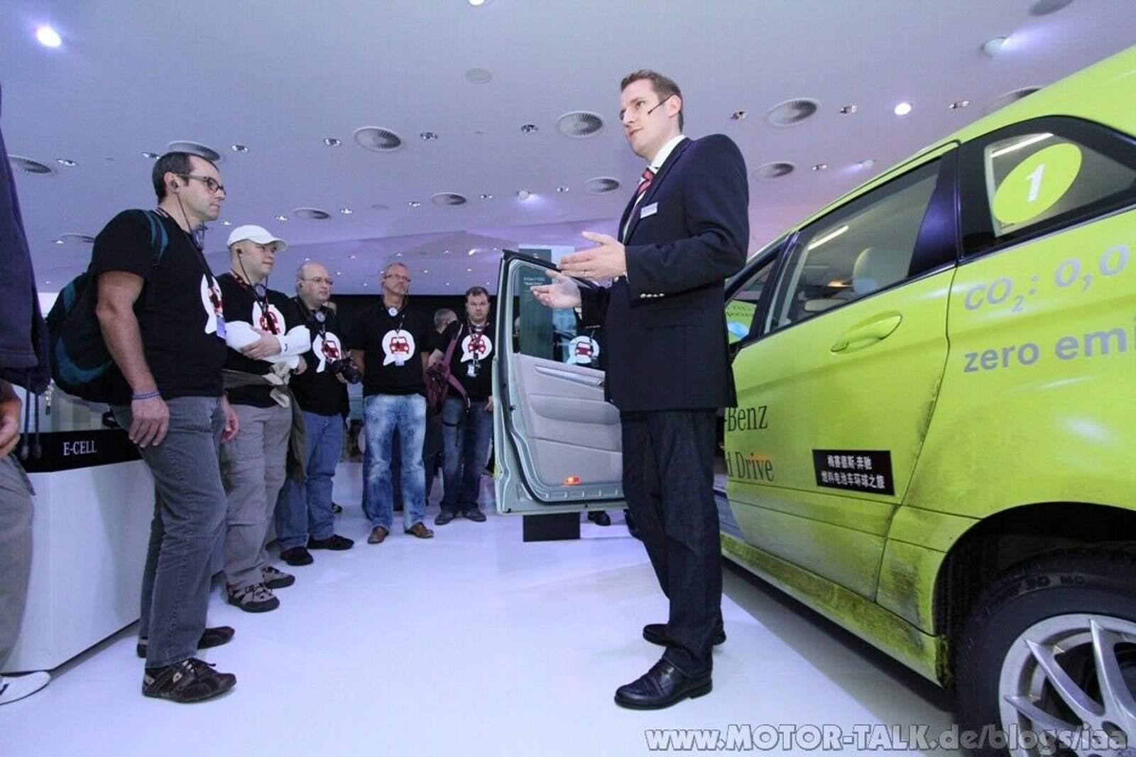 B-Klasse F-Cell “World Drive” Sehr interessant war dann natürlich auch, was die Experten uns bei der Station der Elektroantriebe zu erzählen hatten. Die Concept B-CLASS E-Cell Plus, die A-CLASS E-Cell und die B-Klasse F-Cell “World Drive” wurden uns im Detail erklärt. Sehr schön war natürlich, dass tatsächlich eines der drei Originalfahrzeuge des “World Drive” ausgestellt wurde. Wer nicht weiß, was der „World Drive“ ist: Am 29. Januar 2011 – sehr bezeichnend: Das war der Tag des 125. Geburtstags des Automobils – schickte Mercedes-Benz drei brennstoffzellenangetriebene B-Klassen auf eine Reise rund um den Globus. Der World Drive sollte belegen, dass die B-Klasse F-Cell als erstes serienreif gefertigtes Brennstoffzellen-Fahrzeug durchaus alltagstauglich ist. Emissionsfrei in 125 Tagen durch 14 Länder auf 4 Kontinenten fahren, auf Nord- und Südhalbkugel und über alle Arten von Wegen und Straßen, über Schnee und Eis bis hin in die Wüste. So stand die B-Klasse dann auf der IAA auch vor uns: mit „Original-Dreck“, der überlackiert wurde… Sehr authentisch und somit eine schöne Idee von Mercedes-Benz.