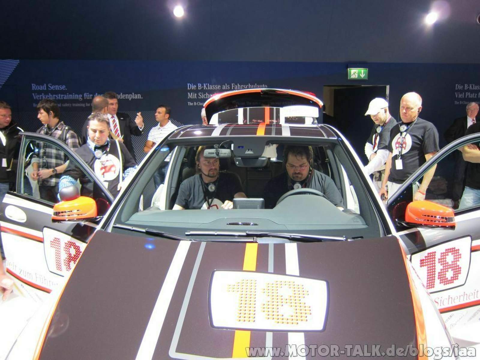 Noch einmal Fahrschüler sein... Erster Anlaufpunkt unserer Gruppe war die neue B-Klasse, die auf der IAA ihre Weltpremiere feierte, und mit der Mercedes-Benz im Kompaktwagensegment punkten will. Die 2. Generation des Sporttourers wurde u.a. als Fahrschulauto ausgestellt und löste mit seiner getunten Optik sogar bei den Jüngeren eine Art „Haben-wollen-Reflex“ aus. Das alte Image hat wohl ausgedient. Die neue B-Klasse wurde des Weiteren auch als Polizei- und als Taxiversion ausgestellt.