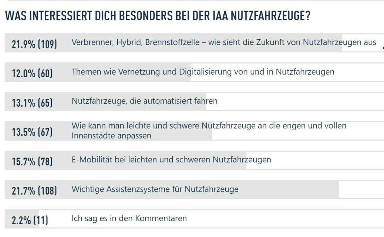 Eure Interessen richten sich an die Zukunft: Fast jeder vierte von Euch möchte auf der IAA Nutzfahrzeuge erfahren, mit welchen Antrieben sich Lkw und Busse künftig durch die Lande – und vor allem durch die schadstoffbelasteten Städte – bewegen. „E-Fahrzeuge sind in der Stadt definitiv sinnvoll“, schreibt ein MOTOR-TALKer. Diesel-Fahrverbot und volle InnenstädteMit 15,8 Prozent belegt das Interesse an E-Mobilität Platz 3. Auch hier spielt der Wunsch einiger MOTOR-TALKer nach geringerem Einsatz fossiler Brennstoffe mit hinein, gerade bei schweren Maschinen. Und natürlich Überlegungen dazu, wie der Nutzfahrzeugbetrieb in Zeiten von Diesel-Fahrverbot und immer strengeren Umweltauflagen praktikabler gestaltet werden kann. „Fahrverbote gefährden Existenzen, da müssen die Betriebe notgedrungen reagieren“, schreibt ein MTler. Möglichkeiten und Realitäten dazu werden auch in anderen Kommentaren diskutiert: „Mich interessiert Elektromobilität für den kommunalen Einsatz grade bei Feuerwehren“, heißt es da. Und jemand anderes öffnet das Feld und fragt, wie es z.B. bei der Müllabfuhr, in öffentlichen Verkehrsmitteln, bei Rettungswagen aussieht? Dazu passt, dass in Eurem Ranking auf Platz 4 mit 13,3 Prozent die handfeste Frage steht: „Wie kann man leichte und schwere Nutzfahrzeuge an die engen und vollen Innenstädte anpassen?“. In immer dichteren Ballungsräume sind Euch nicht bloß Regularien und Abgaswerte, sondern auch Wagendesign und –technik wichtig. „Nutzfahrzeuge, die automatisiert fahren“ interessieren 13,1 Prozent der MOTOR TALKer. Das scheint einem MTler vor allem auf Autobahnen sinnvoll: „Auf Autobahnen ist autonomes Fahren viel leichter zu realisieren als in den Städten, wo es nicht nur geradeaus geht. Auf Autobahnen gibt es auch nur selten Fußgänger, Radfahrer und Ampeln :-)“. Ein weiterer Nutzer wünscht sich darüber hinaus praxisnah „ein System zur Parkplatzbelegungserkennung mittels GPS und Parkplatzdaten. Das verhindert überfüllte Parkplätze“. Ein anderes Community-Mitglied fragt: „Was gibt es denn Neues bei den Rasenmähertraktoren?“ – das sind ja schließlich auch Nutzfahrzeuge. Und ein MOTOR-TALKer macht richtig Ernst: Ihn interessieren „die vierachsigen Schwerlastzugmaschinen à la Actors SLT 4163 und MAN TGX 41.640“. |