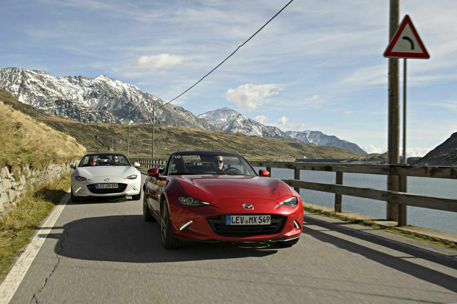 Und weiter Richtung St. Moritz Die elf MX-5 für die 22 Teilnehmer sind allesamt mit dem 2.0-Liter Motor mit 160 PS ausgestattet. Das Team MOTOR-TALK fährt einen Mondstein-weißen Roadster mit Recaro-Sitzen und Bose-Ausstattung. Trotz des straffen Roadsterfahrwerks fühlen sich auch 11 Stunden Fahrt bequem an. In diesem Auto sind die Insassen nicht nur mit der Straße verbunden, sondern auch mit den Elementen. 2.500 Meter Höhe, das verschneite Timmelsjoch, wolkenverhangene Gipfel und die stockfinstere, zum Teil einspurige Abfahrt am Umbrailpass: Schon am ersten Tag erlebt man „Jinba Ittai“ – Ross und Reiter sind eins. Offenfahren ist Ehrensache. Dank Sitzheizung wird das Team MOTOR-TALK auf der gesamten Tour nur einmal zehn Minuten das Verdeck schließen.