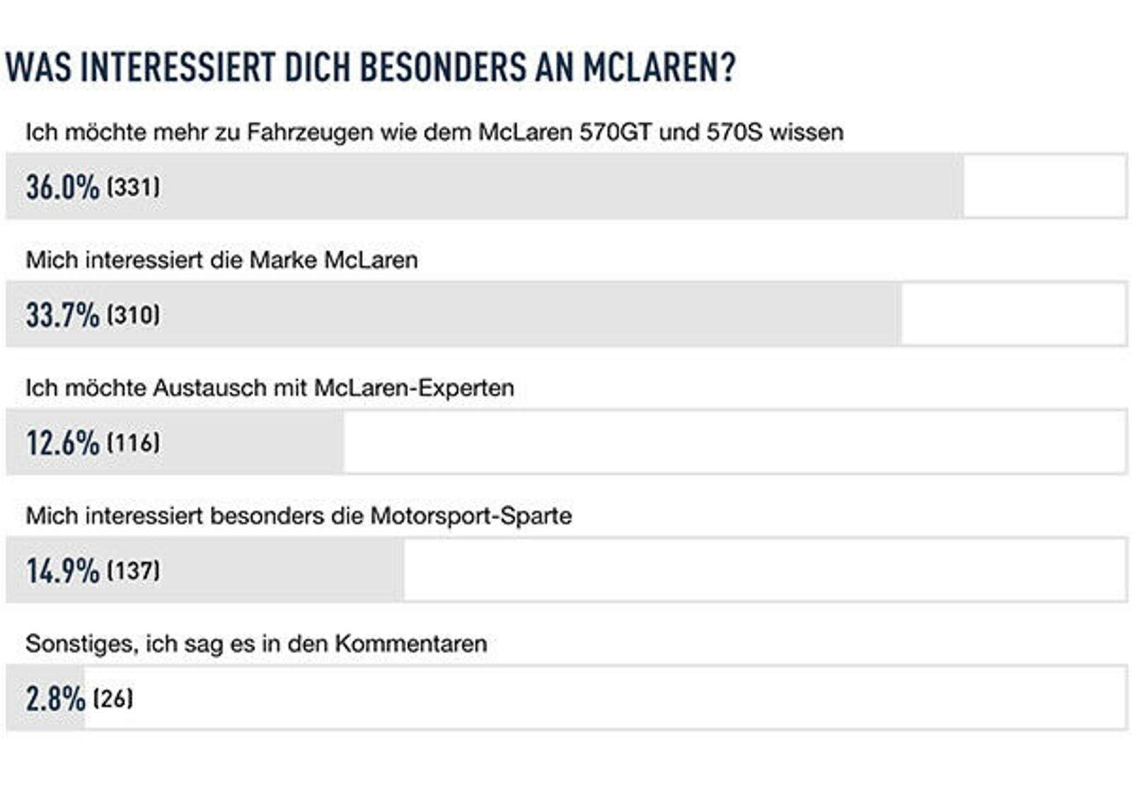 Da McLaren noch ganz frisch im Forum ist, wollten wir wissen, was Euch an dem Supersportwagen-Hersteller besonders interessiert. Hier stellen wir Euch die Ergebnisse vor. Mehrfachnennungen waren möglich. An den Kommentaren sieht man, dass viele von Euch die Chance ergreifen wollen, einmal einen Supersportwagen wie den 570S zu fahren oder Rennstreckenerfahrung zu sammeln. Aber auch die Technik unter dem Blech, die Verarbeitung, Fahrdynamik und Alltagstauglichkeit interessieren Euch. Nutzer sprintasport bringt es auf den Punkt: „Es ist ja gar nicht nur das schnelle Fahren oder die tolle Beschleunigung dieses Haufens Hitech, als vielmehr die Tatsache, dass solche Fahrzeuge einen Menschen auch emotional berühren, eben etwas ganz "Besonderes" sind, also mehr sind als nur die Summe ihrer Teile. Technisch wie bauchmäßig. Beim Anblick solcher Autos spürt man Rennsportgeschichte, hört insgeheim das F1-Publikum der 70er, 80er und 90er Jahre jubeln und glaubt den Atem von Fittipaldi und Alonso zu spüren.“ Und ein Teilnehmer an der Umfrage erlebt das am eigenen Leib und fährt zum Hockenheimring. Der Gewinner ist: Selection84. Weitere Infos zum Event findet Ihr hier. Herzlichen Glückwunsch! Halt uns ruhig auf dem Laufenden und erzähl uns, wie es war. |