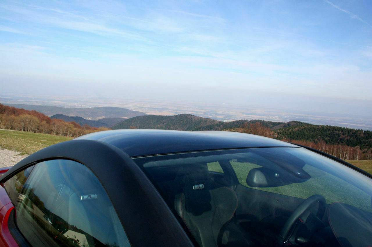 Im „Formationsflug“ ging es mit den drei Fahrzeugen bis zum nächsten Treffpunkt. Nun gut, wir sind alle samt erst einmal am Aussichtspunkt „Belvédère de Spitzenfels“ vorbeigerauscht und den „Col de la Schlucht“ heruntergefahren. Dass war ja nicht das erste Mal, wo wir hätten umkehren müssen. Also kleines Wendemanöver eingeleitet, zurück zum Aussichtspunkt, kurz den Weitblick genießen und ein paar Fahrminuten später mit dem gesamten Team auf einem Parkplatz zusammentreffen um einen Fahrzeugwechsel durchzuführen. Wir sind die ersten beiden Etappen mit dem RCZ R gefahren und wechselten nun für die letzte Etappe auf den RCZ 1,6 200 THP. Es sollte ja schließlich jeder Tester auch die beiden R-Modelle ausgiebig fahren können.