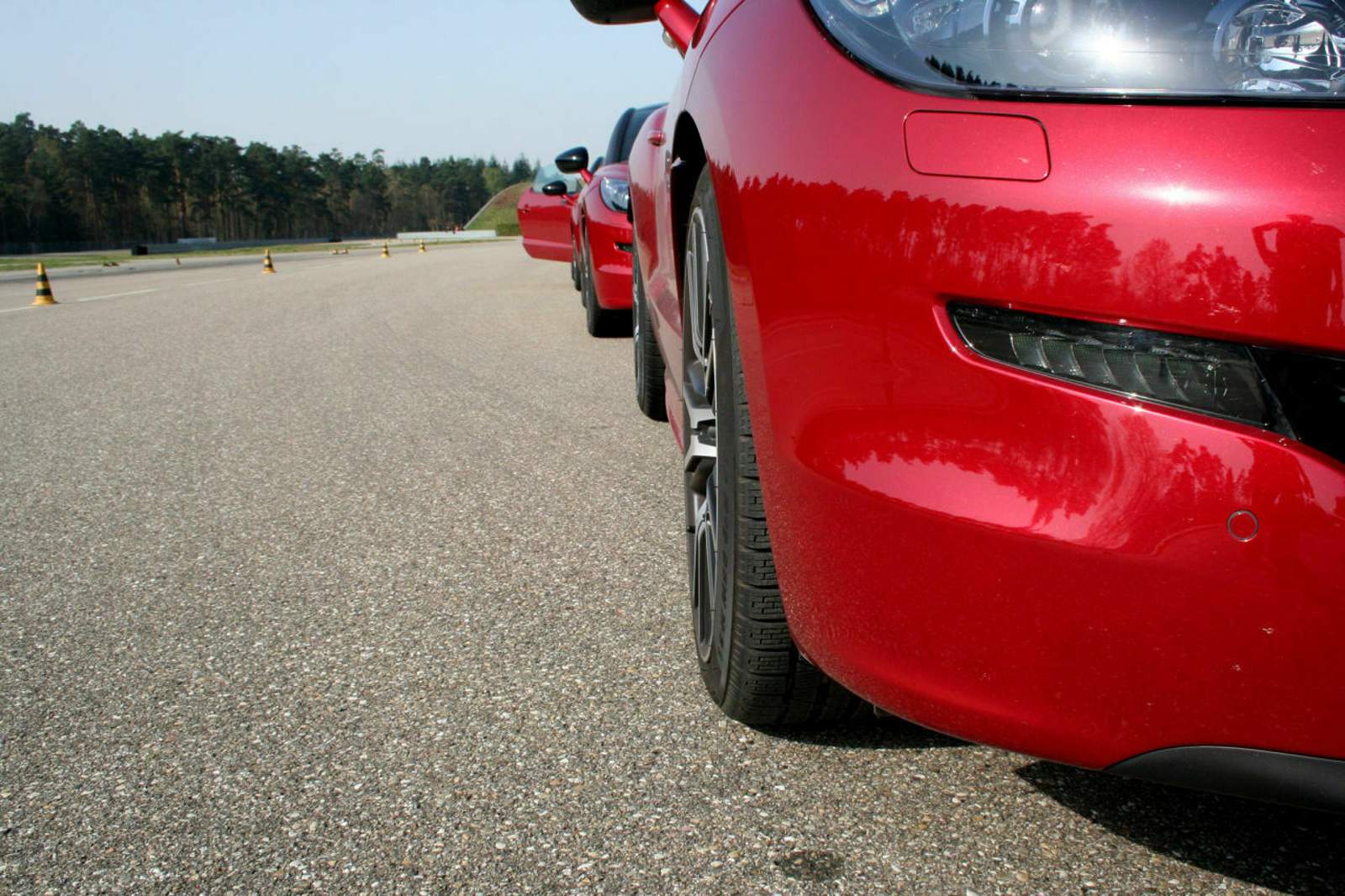 Rein in den Wagen, nochmal die optimale Sitzposition finden, Klimaanlage und Radio ausschalten (das kostet ja schließlich nur unnötig Leistung ) und los kann es gehen. Hinter Benjamin gab es nochmal eine Aufwärmrunde. Dann wurde das Tempo stetig erhöht. Hart anbremsen, zurückschalten, einlenken und möglichst flach an den Scheitelpunkt der Kurve fahren, wieder rauf aufs Gas, sich raustreiben lassen. Ausdrehen, nächster Gang rein und das Ganze wieder von vorne. Der Handlingkurs ist gespickt mit Kurvenfolgen. Das geht natürlich auf das Material. Sowohl beim Fahrer, als auch beim Fahrzeug. Mir war jedenfalls mindestens genau so warm, wie den armen Winterreifen, die stark um Haftung rangen und den Bremsen, die kaum Zeit zum Abkühlen fanden. Vielleicht lag das jedoch auch an den geschlossenen Fenstern und der abgeschalteten Klimaanlage. In der Box die Fenster zu öffnen, war die reinste Wohltat. Rennsportfeeling pur! Wenn auch durch manuelles Ausschalten der Komfortfunktionen selbst herbeigeführt.