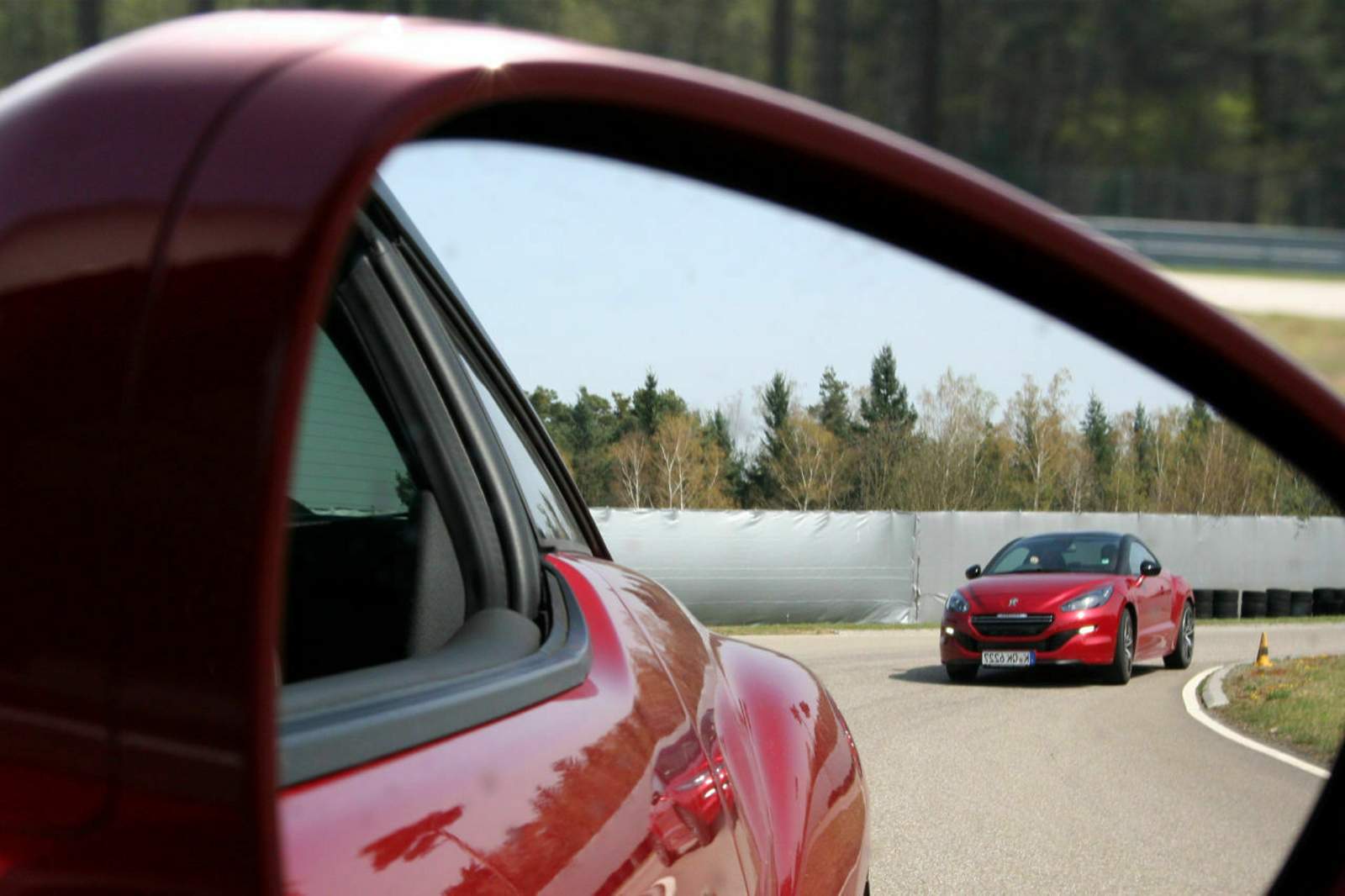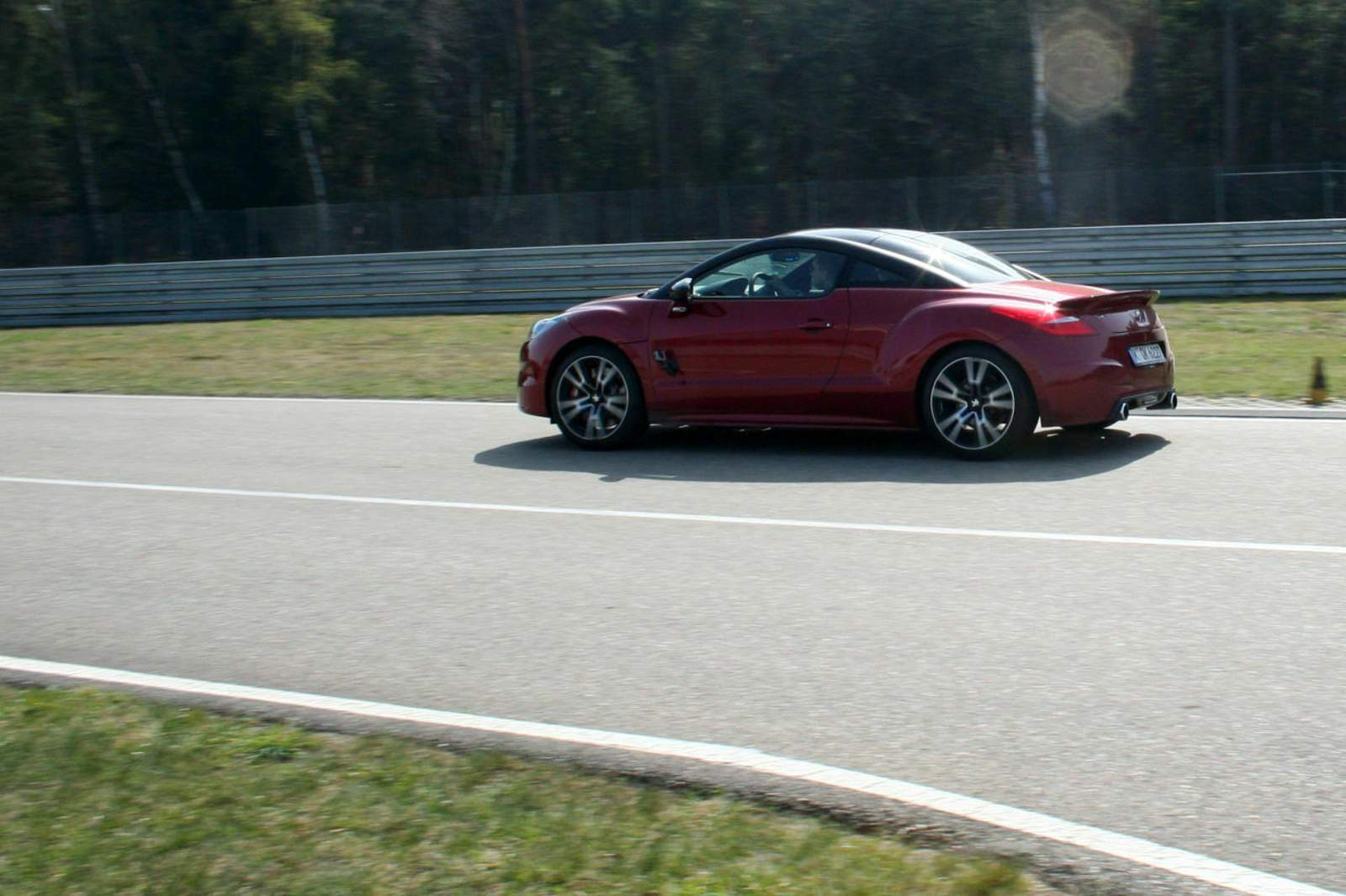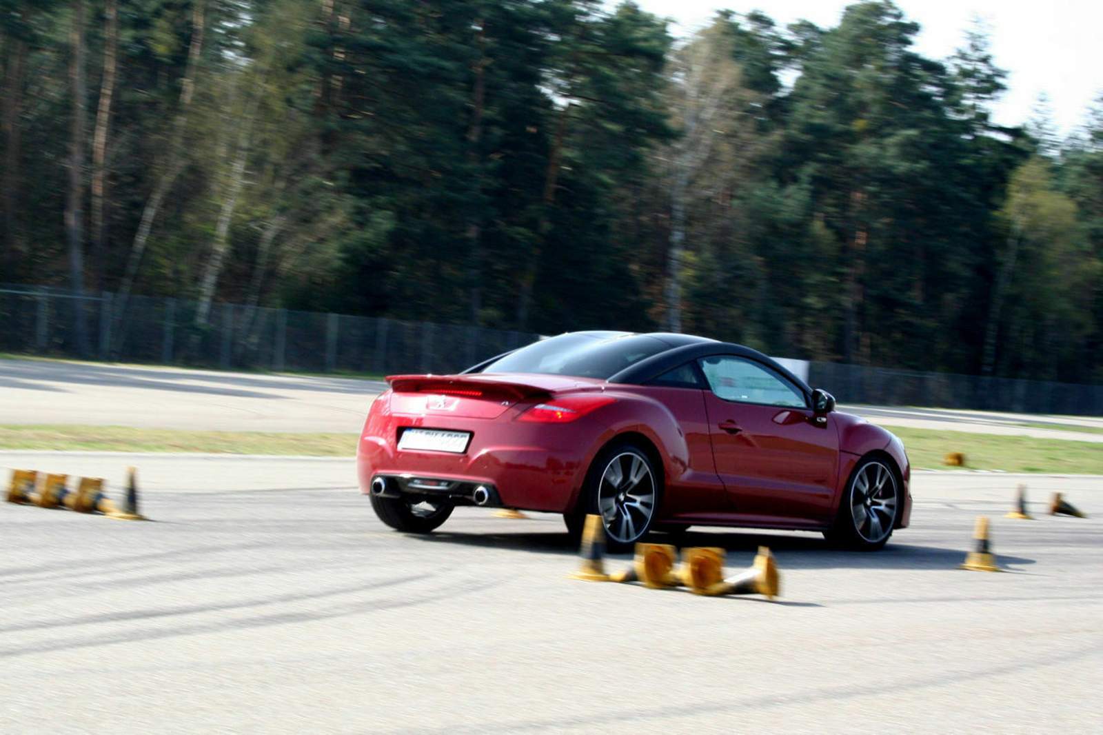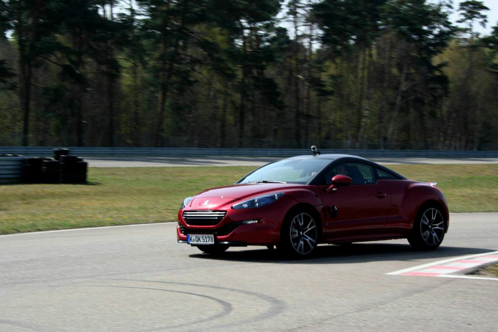 Jetzt aber schnell auf den Handlingkurs. Das konnten wir wohl alle kaum erwarten. Erst einmal die Einführungsrunden, um die Strecke kennen zu lernen. Per Funk wurden von unserem Instruktor die Strecke mit ihren Eigenschaften erläutert, sowie Einlenk- und Scheitelpunkte der einzelnen Kurven aufgezeigt. So konnte man sich nach und nach die Ideallinie einprägen. Raus in die Boxengasse und Fahrzeugwechsel. Ab jetzt fuhr Benjamin im “kleinen“ RCZ voraus und wir Tester, in den beiden R hinterher. Meine Begleitung und ich setzten zuerst aus. Vad und Superstrose fuhren nun den ersten Turn des Tages. Mit einem Erfrischungsgetränk in der Hand, bei bestem Wetter, stand ich am Streckenrand und konnte beobachten, wie die Geschwindigkeit von Runde zu Runde gesteigert wurde. Quietschende Reifen, aufheulende Motoren und der Geruch von Rennsport lag in der Luft. Da wurde ich dann doch etwas nervös, als der erste Turn zu Ende ging und die Anderen die Boxengasse ansteuerten.