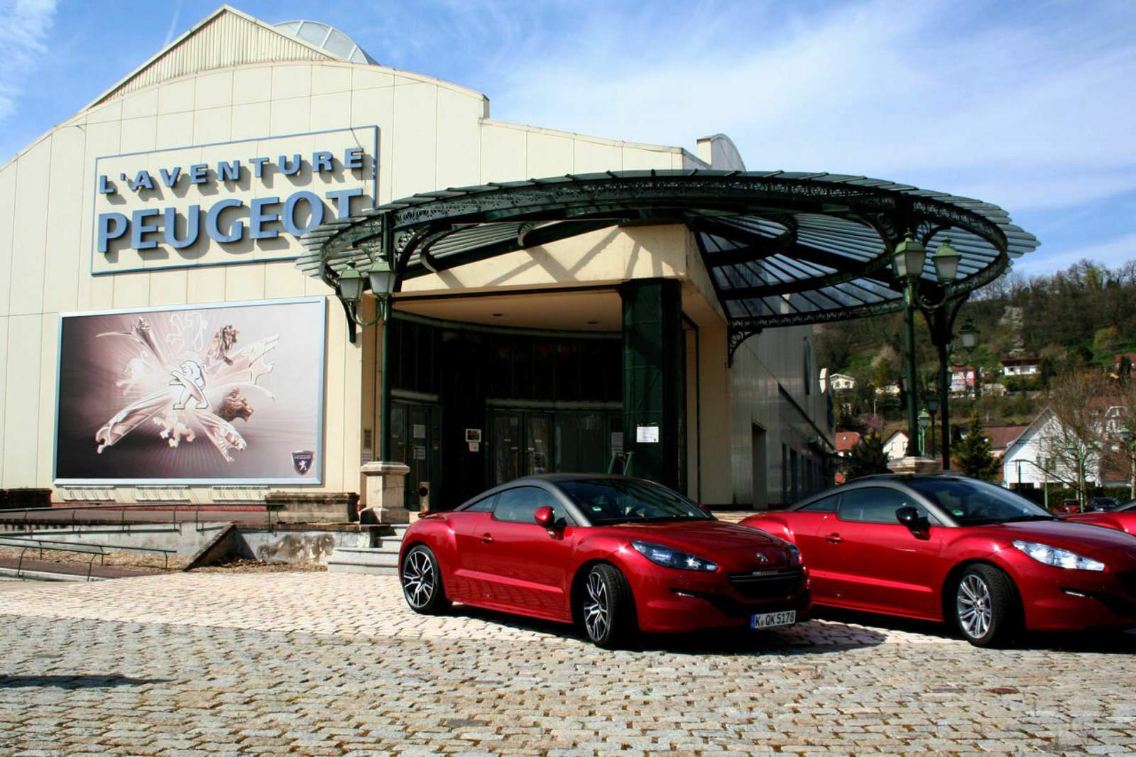 Vor dem Museum waren bereits ein RCZ 1,6 200 THP und die beiden RCZ R drapiert und glänzten in der Sonne um die Wette. Alle drei Fahrzeuge waren in Metallic Erithrea Rot lackiert, was sich meiner Meinung nach besonders gut mit den schwarzen Applikationen verträgt. Michael Bohrer und Frédéric Renard stellten uns die Fahrzeuge mit ihren technischen Details vor. Nach einem kurzen Shooting und dem obligatorischen Gruppenfoto, konnte die Ausfahrt dann auch schon starten.