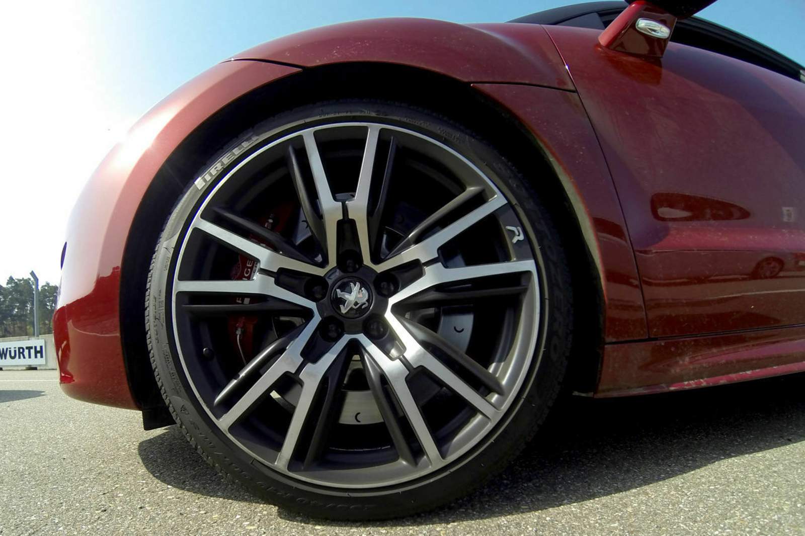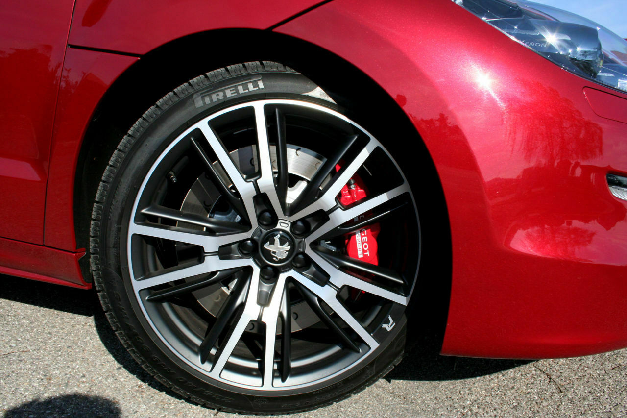 Der RCZ R steht serienmäßig bereits 10 mm tiefer als seine kleinen Brüder auf ebenfalls standardmäßigen, sehr schönen, zweifarbigen, 8,5“ breiten, 19-Zoll-Felgen. Das direkt aus dem Alu gefräste „R“ ist ein schönes kleines Detail. Bereift ist das R-Modell mit 235/40 R19 (in unserem Fall) Pirelli Sottozero Winterreifen.