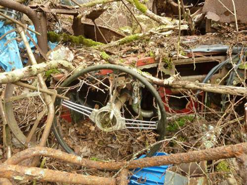 Gestern waren wir im Rahmen von Erkundungen der "Forschungsgruppe Westwall" in der Eifel unterwegs, im Hofbereich eines Bunkers vom Typ 106 (MG-Schartenstand mit Gruppe) haben wir neben einer Menge anderem Schrott das Wrack eines älteren Autos gefunden.