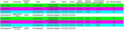 man muß in der Tabelle immer die gleichfarbigen Abschnitte vergleichen, dann sieht man sehr schön das die Strecken bis auf geringe Naviabweichungen die normal sind immer die gleichen sind, genauso die Geschwindigkeit, am genauesten ist es bei dem Autobahnabschnitt da dieser komplett mit Tempomat gefahren wurde, selbst die Fahrzeiten sind fast gleich wie man sieht, auf den Landstr Abschnitten ist es mir nicht so 100%ig gelungen, aber auch nur geringe Unterschiede