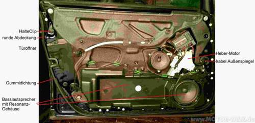 Das geht aber nicht so ohne weiteres, da die Verkleidung mit diversen Plastik-Verbindern an der Tür befestigt ist. Ich habe keine Methode gefunden, wie man diese Verbindung sauber lösen kann, es bleibt nur „ordentlich ziehen“. Dabei können/gehen die Plastik-Teile aber leicht kaputt und können (Hörensagen) nicht ersetzt werden, weil es die Teile nicht mehr gibt.