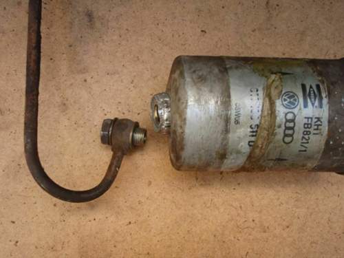 Da konnte ich doch eine wunderschöne Benzinfontäne beobachten, die aus dem Flansch (Bild) des Benzinfilters schoß und den Benzinpumpenbehälter benetzte.