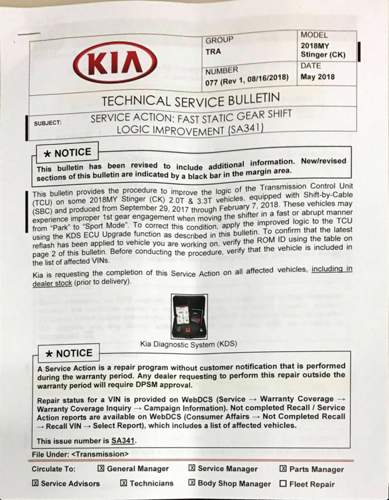 Vermutlich wissen die wieder von nix. War bei meinen TSB Besuchen jedenfalls so. Die können nicht auf die Daten von KIA USA zugreifen und bekommen offensichtlich auch nicht die TSB weitergeleitet, obwohl es die gleichen Autos sind.