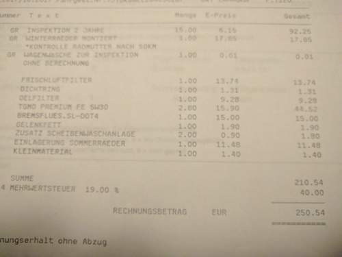 Also, wie Du auf unserer Rechnung ersehen kannst, kostet die 2 Jahresinspektion 92,25€ netto