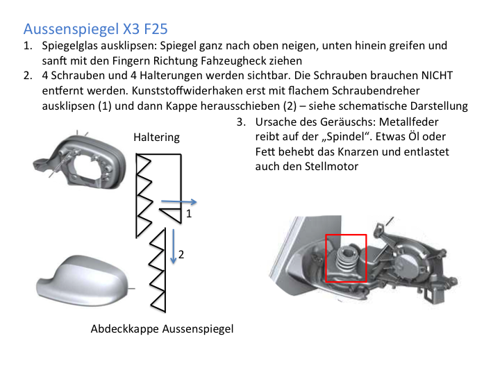 Ein paar andere Beiträge dazu - "Knarzender Spiegel" z.b. - sei es bei BMW, Volvo, VW, etc. usw.....