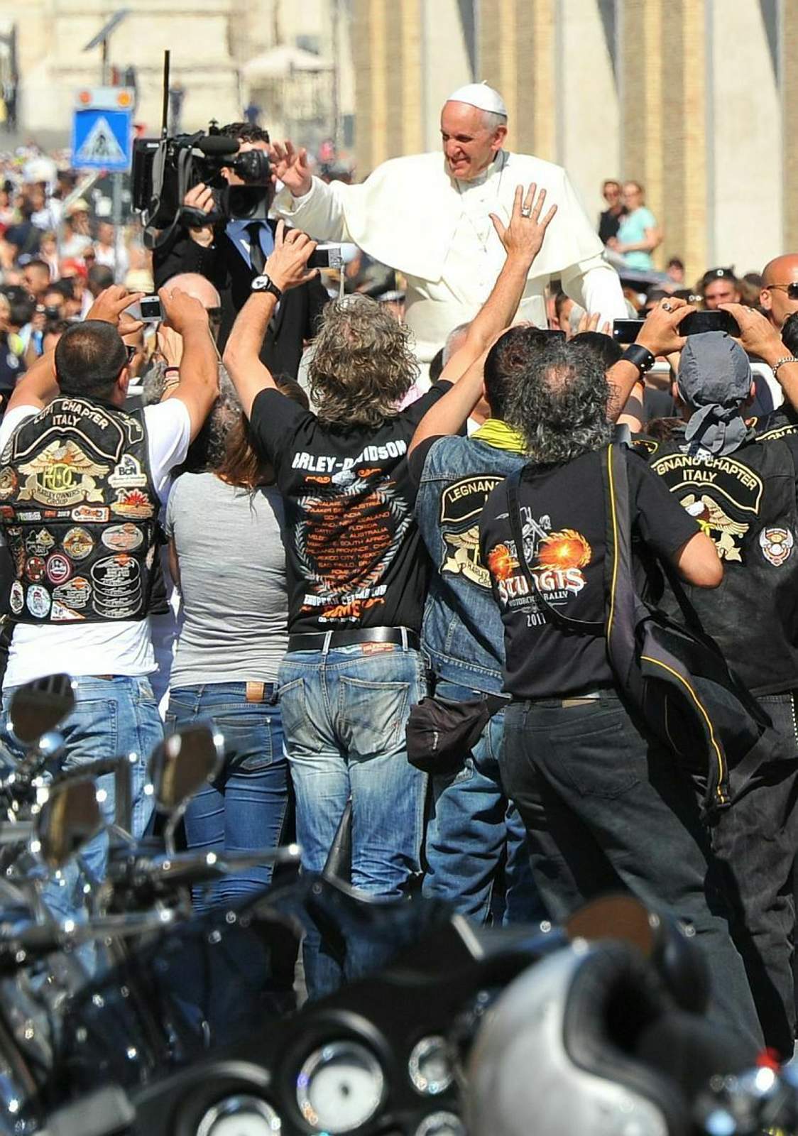 Harte Jungs (und Mädels) und der Heilige Vater: Papst Franziskus segnete in Rom Teilnehmer der 110-Jahres-Feier von Harley-Davidson, samt ihrer Motorräder.