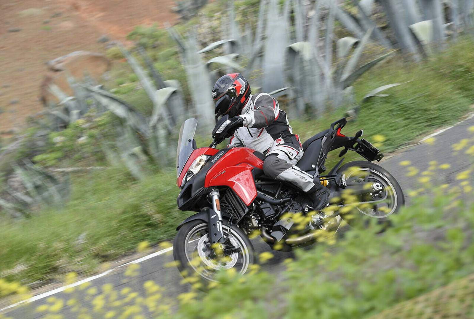 Fuerteventura - Große Hubräume sind sexy. Und weil wir alle sexy sein wollen, sind „big bikes“ wie die Ducati Multistrada 1200 in Deutschland verdammt gefragt: 160 PS, in der S-Version mit allen nur denkbaren Hightech-Finessen ausgestattet und mit netten Zubehör-Details schnell 20.000 Euro teuer. Klein? Von wegen.Herzstück der „kleinen“, in Wahrheit nämlich ausgewachsenen Multi 950 ist der im vergangenen Jahr präsentierte 937-ccm-Motor, der auch in der Hypermotard 939 arbeitet und demnächst noch in der neuen Supersport eingebaut wird. In seiner jüngsten Konfiguration ganz sicher ein Traum-Motor. Durchzugsstark, drehfreudig, kultiviert – der V2 kann einfach alles. Mit 113 PS ist die 227 Kilogramm wiegende Multistrada ausgewogen motorisiert. Zwischen 3.500 und 9.500 U/min liegen stets mehr als 80 Prozent des maximalen Drehmoments an. In jedem Drehzahlbereich oberhalb von 2.500 Touren schnalzt der mit desmodromischer Ventilsteuerung ausgerüstete Beinahe-Tausender los, dass es die pure Freude ist. Blitzartig steigt die Drehzahl, geschmeidig lassen sich die Gänge wechseln. Mit 5,3 Litern Super ist der angegebene Spritkonsum okay, der Praxisverbrauch liegt tatsächlich ungefähr bei diesem Wert. Voll einstellbares FahrwerkDas Fahrwerk der Multistrada 950 liegt mit mechanisch voll einstellbaren Komponenten an Vorder- und Hinterrad absolut auf der Höhe der Zeit. Die Grundabstimmung passt dabei gut. Die geschickt gewählten Rad- und Reifendimensionierungen machen die 950er zur agilsten Multistrada überhaupt: Sie lenkt leicht ein, hält den gewählten Radius sicher und ist doch noch zugänglich für Kommandos des Fahrers. Ein Aufstellmoment beim Bremsen in Schräglage gibt es nicht; man kann weit in Kurven hineinbremsen. Die Dreischeiben-Bremsanlage wurde 1:1 von der 1200er-Multi übernommen und arbeitet auf sehr hohem Niveau. Das gilt auch für das einstellbare Bosch-ABS. Mit 227 Kilogramm ist die Ducati eine der leichteren Reiseenduros auf dem Markt. Das spürt man beim Fahren: Sie lässt sich leicht dirigieren, Wende- und Rangiermanöver klappen ohne großen Kraftaufwand von der Hand. Die Ergonomie ist gelungen und unterscheidet sich im Grunde nicht von der des Schwestermodells. Abstriche stehen nur bei der Ausstattung an: Viele der „nice-to-haves“ der 1200er oder gar der 1200 S (schlüsselloses Startsystem, verstellbare Sitzhöhe, LED-Scheinwerfer mit Kurvenlichtfunktion, Einarmschwinge, semiaktive Fahrwerksregelung) wurden eingespart, um den Preis von 12.990 Euro realisieren zu können. Diverse nützliche Details sind aber in Form von vier Ausstattungspaketen zukaufbar. Pfiffig: die Befestigung der seitlichen Gepäckbehälter. Hier können wahlweise Kunststoffkoffer oder Touratech-Aluboxen fixiert werden. Schade: Die sehr gut aussehenden Drahtspeichenräder sind nicht ab Werk montiert, sondern müssen gegen viel Geld zusätzlich erworben werden. Durchaus offroad-tauglichBedauerlich ist das nämlich auch, weil die 950er – im Gegensatz zur 1200er – durchaus eine passable Offroad-Eignung mitbringt. Das ist primär dem größeren Vorderrad und sekundär am schmaleren Hinterrad zu verdanken. Dazu dürfen auf den Felgen der Duc übrigens auch Stollenreifen montiert weren. Doch so positiv sie in vielen Punkten wirkt: Frei von Unstimmigkeiten ist sie nicht. Das Menü des Bordcomputers bliebt unübersichtlich. Und ein selbstrückstellender Blinker zählt in der 13.000 Euro-Klasse nun wirklich nicht als Luxus. Wer allerdings mit der im Frühjahr erscheinenden KTM Adventure 1090 liebäugelt, sollte die Ducati 950 Multistrada nicht aus den Augen verlieren – beide Bikes liegen auf Augenhöhe. Weitere Konkurrentinnen der Ducati sind die Honda Africa Twin, die Suzuki V-Strom 1000 und die Kawasaki Versys 1000. Ob die 950 Multistrada sich da durchsetzen kann, ist fraglich. Klar ist aber schon jetzt: Sie ist die zugänglichste und am angenehmsten zu fahrende Multistrada-Version, weil sie den Fahrer weitaus weniger fordert als die 1200er-Varianten. Der Fahrspaß leidet darunter kein bisschen. Ducati Multistrada 950 - Technische Daten