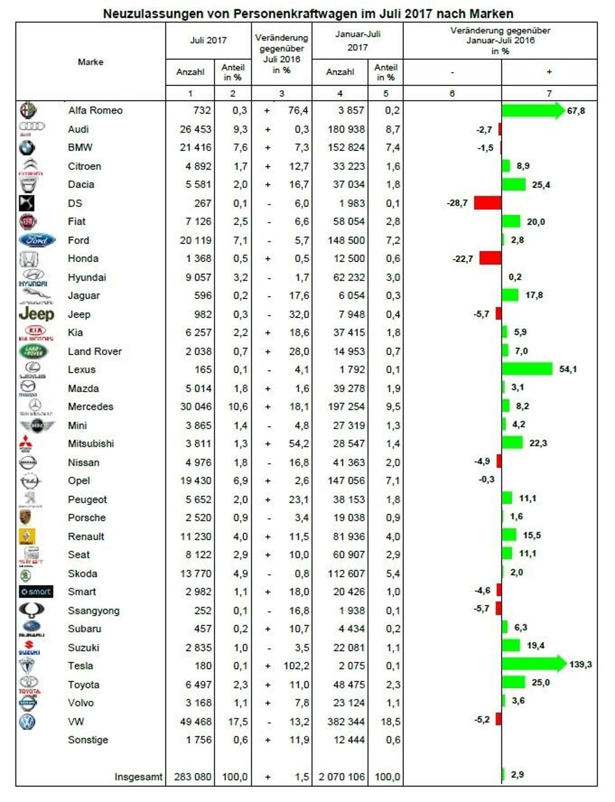 Im Vergleich zum Vorjahreszeitraum wurden im Juli 2017 mehr PKW neu zugelassen. Nicht alle Marken profitierten von dem Mini-Wachstum.