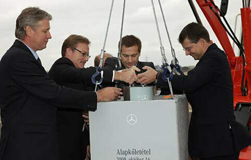 Über die Nachfolgemodelle von Mercedes A- und B-Klasse gibt es viele Spekulationen, aber ungewöhnlich wenig Handfestes. Das neue Werk in Ungarn, wo diese Baureihen ab 2012 produziert werden sollen, feierte heute die Grundsteinlegung. Im Beisein des ungarischen Ministerpräsidenten Gordon Bajnai gaben Rainer Schmückle, Chief Operating Officer von Mercedes-Benz Cars, sowie der Werksbau-Projektleiter Michael Frieß den Startschuss zu den Bauarbeiten in Kecskemét. Die Notwendigkeit für das neue Werk begründet Mercedes mit dem Bedarf an zusätzlichen Kapazitäten, weil aus A- und B-Klasse künftig vier Modelle werden sollen. Die Produktion erfolgt dann neben dem bestehenden Werk in Rastatt, das erweitert wird, an dem neuen Standort in Ungarn. Der Autobauer investiert hier eigenen Angaben zufolge rund 800 Millionen Euro. Bereits Anfang Juli war auf dem Gelände mit den vorbereitenden Baumaßnahmen (Landlevelling) begonnen worden. Mit der heutigen Grundsteinlegung starten die Bauarbeiten für die Lackiererei der neuen Fabrik, die als erstes Gebäude entsteht. Ab Anfang 2010 sollen dann der Aufbau des Rohbaus und der Montagehallen folgen. Parallel zum Start der Baumaßnahmen hat die örtliche Mercedes-Benz Manufacturing Hungary Kft. auch mit der Einstellung und Qualifizierung einer Kernmannschaft von Mitarbeitern vor Ort begonnen. Die ersten Stellen wurden in den Bereichen Verwaltung, Personal oder Controlling besetzt, zudem sind erste technische Spezialisten für das künftige Werk eingestellt worden, die ihr entsprechendes Qualifizierungsprogramm begonnen haben. Langfristig sollen im neuen Werk 2.500 Arbeitsplätze entstehen. Die Daimler AG hatte im Juli 2008 Vertretern der ungarischen Regierung und der Stadtverwaltung eine Absichtserklärung über das Bauvorhaben unterzeichnet. Ende Oktober folgte die finale Vertragsunterzeichnung, im Februar 2009 der Kaufvertrag für die 440 ha große Fläche. Kecskemét liegt ca. 90 Kilometer südöstlich von Budapest und hat etwa 110.000 Einwohner. Quelle: Autokiste |