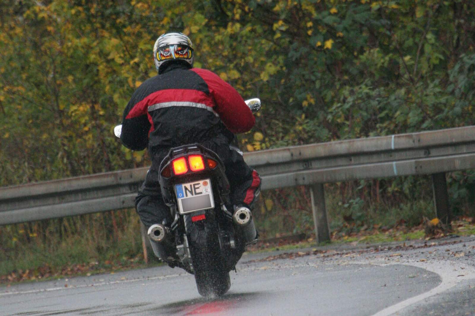 Hartgesottene Biker trotzen dem Wetter und lassen sich auch von einem Schauer nicht abhalten. Doch Regen und nasse Straßen fordern vom Fahrer besondere Umsicht.