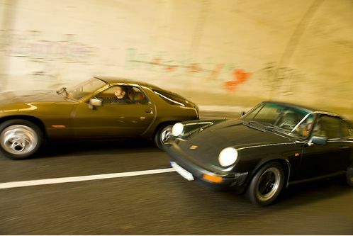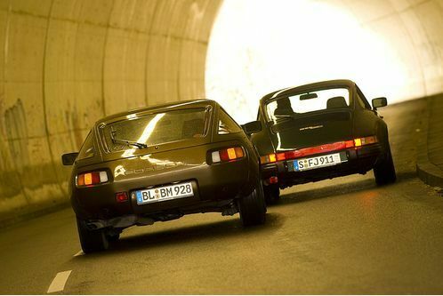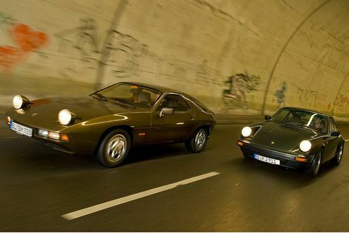 Eine kernige Geschichte über die beiden grundverschiedenen Konzepte, nach denen Porsche zwischen 1977 und 1982 Sportcoupés baute, darf beidseitig feuerverzinkte Sätze enthalten wie etwa jenen aus dem Fachmagazin auto motor und sport, Ausgabe 19 des Jahres 1977: "Kein Zweifel. Der berühmte Elfer wird schon in absehbarer Zeit sterben und damit dasselbe Schicksal erleiden wie sein Vorgänger mit der Typenbezeichnung 356." Auch aus der vermuteten Todesursache des luftgekühlten Sechszylinder-Porsche machte die damals zeitgemäße Prognose keinen Hehl: "Ein Nachfolgemodell ist schon vorhanden, nämlich in Gestalt des neuen Porsche 928." Als dessen leiserer, von Wasser gekühlter und im Abgasverhalten optimierter V8 am Sportwagen-Horizont heraufzog, schien also der Untergang des lärmig luftigen Sixpacks im Porsche 911 beschlossene Sache zu sein. Drei Jahrzehnte Abstand haben inzwischen geklärt, was von der Weissagung zu halten war: Den Elfer gibt es heute noch immer, wenn auch mit jetzt wassergekühltem Boxermotor, und dieser Aqua-Ali verweist den zum Schluss 5,4 Liter großen V8 und seine 350 PS seit 14 Jahren auf die Plätze. 928: Der Porsche aus der Parallelwelt Heute stehen die ungleichen Brüder der frühen Jahre vor oder gar schon kurz hinter der Schwelle zum Oldtimer. Der Porsche 911 wurde auf der IAA im Herbst 1977 mit dem offiziellen Namenskürzel SC vorgestellt. Das steht für Super Carrera und spielt auf das sportliche Vorgängermodell Porsche 911 Carrera 3.0 mit 200 PS an, von dem es die hinten etwas voluminösere Karosserie geerbt hat zur Aufnahme der sieben Zoll breiten Antriebsräder. Zwölf Jahre sind da seit dem letzten Porsche SC ins Land gegangen - das war 1965 der 356. Als der Porsche 911 SC debütierte, war der Porsche 928 schon ein halbes Jahr alt. Letzterer erblickte bereits im März auf dem Genfer Salon das grelle Rampenlicht der Welt. Er war, wie man heute sagen würde, ein Porsche aus der Parallelwelt - mit Frontmotor und Heckantrieb in Transaxle-Bauweise, im Konzept eher dem Porsche 924 verwandt. Das brandneue Porsche 928-Coupé rief die Lästermäuler auf den Plan wie etwa den Berliner Designer Lutz "Luigi" Colani, der die von Porsches Design-Chef Anatole Lapine gefundene Form mit gewohnt großer Klappe kommentierte: "Der 928 sieht aus wie eine Bulette ohne Arsch und Gesicht." Lapine blieb gelassen, verzichtete auf eine Beleidigungsklage gegen Colani und begründete die rundliche Linie des Porsche 928 mit dem Verweis auf den amerikanischen Markt: "Porsche wollte dort mit dem 928 neue Segmente erobern, und damals wurde in den USA gerade extrem viel Wert gelegt auf Sicherheit beim Frontal-Crash und hohen Schutz beim Seitenaufprall. Daher rührt die bauchige Form mit den üppigen Knautschzonen." Auch unter dem Blech des Porsche 928 folgte die Technik neuesten Erkenntnissen der Unfallforschung. Über das Konzept mit Frontmotor, starrem Transaxle-Rohr und dem mit dem Hinterachsantrieb verblockten Getriebe konnte die frontale Aufprallenergie über die Hinterachse von der gesamten Karosserie aufgenommen werden. Die Idee dazu geht bis in das Jahr 1970 zurück, als Porsche für Volkswagen das im Herbst 1971 dann wieder gekippte Mittelmotor-Projekt EA 266 entwickelte. Aus verschiedenen Entwürfen kaufte Porsche dann ein Konzept zurück, das als Typ 924 bereits 1975 auf den Markt kam - mit Frontmotor, Transaxle-Rohr und dem zur besseren Gewichtsverteilung hinten liegenden Getriebe. Porsche-Technik im Mercedes SL und Opel Admiral Die Namen der in den siebziger Jahren mit dem Projekt 928 betrauten Konstrukteure sind zum Teil auch aus der Sportgeschichte des Hauses wohlbekannt: Fahrwerksspezialist Wolfhelm Gorissen, Versuchsleiter Peter Falk, der spätere Sportchef Helmut Flegl und Konstruktionsleiter Wolfgang Eyb legten Hand an bei der Geburt des Porsche 928. Vielfältig waren die Prototypen, in denen verschiedene Komponenten des 928 erprobt wurden. Das wie beim Renntyp Porsche 908.03 vor der Hinterachse liegende Getriebe und das Transaxle-System wurden zum Beispiel in einer Mercedes 350 SL-Karosserie getestet. Name des ersten Versuchsträgers: V1. Später kamen weitere Autosklaven hinzu, etwa zur Hinterachserprobung ein Opel Admiral (V2), dann einer von mehreren Audi-100-Aufbauten auf einer Porsche 928-Bodengruppe. Hier im V3 spielte die neue Technik erstmals komplett zusammen, bereits mit der neuen V8-Maschine, die damals noch fünf statt später 4,5 Liter Hubraum besaß. Der in Goldmetallic lackierte, hier vorgestellte Porsche 928 ist ein wirklich frühes Exemplar aus dem April 1977. Seine Sitzpolsterung peitscht den Probefahrer unerbittlich zurück in die psychedelischen Siebziger: Das wellenförmig verschobene, schwarzweiße Schachbrettmuster zwischen dem glänzenden Braun der Sitzflanken wirkt wie eine Zielflagge nach dem Genuss des gesamten Gewinner-Champagners. Der V8 springt ohne Kapriolen auf Anhieb an und summt samtig mit rund 800 Umdrehungen im Leerlauf vor sich hin. Die Kupplung leistet der Wade nur milden Widerstand, der erste von fünf Gängen rutscht hinten links problemlos in die Rastung, und die luxuriösesten anderthalb Tonnen im Porsche-Portfolio von 1977 gleiten seidig voran. Die intelligente Achse heißt Weissach Die Geometrie der Schräg- und Querlenker-Hinterachse des Porsche 928 reduziert den Squat-Effekt laut Prospekt um ein Drittel: Der 928 geht auch beim zügigen Anfahren hinten nur mäßig in die Knie. Den großen Zaubertrick hält die Achskonstruktion aber beim Gaswegnehmen und Bremsen in Kurven bereit: Der Porsche 928 zeigt selbst bei höherem Tempo keinerlei Tendenz zum Eindrehen, denn die auftretende Seitenkraft ändert automatisch die Vorspur der Hinterräder - die Weissach-Achse lenkt mit und unterbindet so das frühe, ungewollte Übersteuern. Die vier Scheibenbremsen packen mit der von Porsche gewohnten, fadingarmen Gewalt. Und auch die Vorderachse des Porsche 928 überrascht mit einer netten kinematischen Spielerei: Die Bremsmoment-Abst