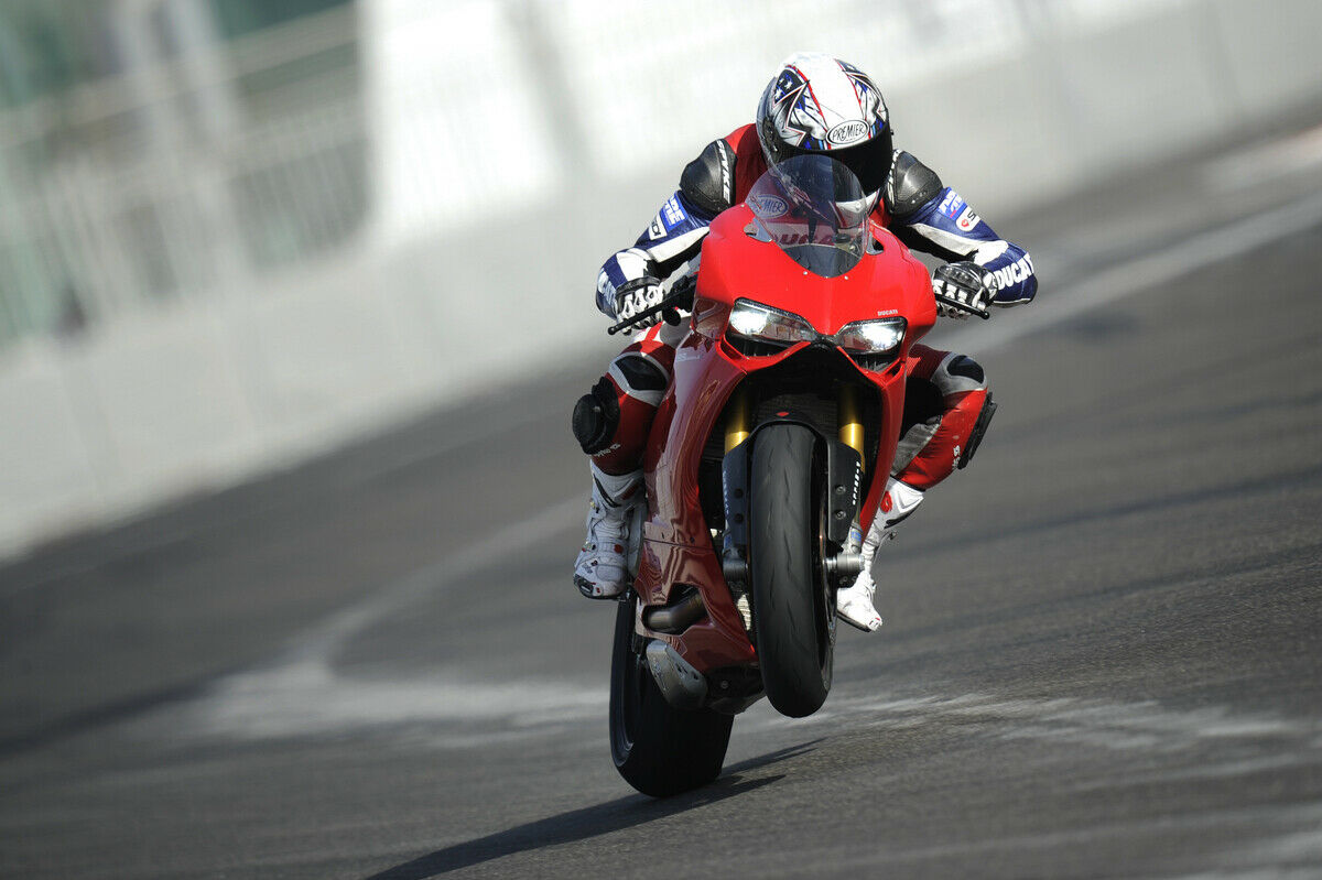 - Es hat Ducati außerdem erlaubt, die Traktionskontrolle massiv zu verbessern. Die 1198 nahm das Drehzahlsignal von ein paar verfügbaren Schrauben ab, und das war grob. Die 1199 nimmt die Drehzahlsignale von den wesentlich feiner auflösenden ABS-Zahnkränzen ab, gleicht das Signal mit der Schräglagensensorik ab (siehe BMW und Aprilia) und regelt dann sehr sanft zu über 95 Prozent über die Drosselklappen (siehe ebenfalls BMW und Aprilia). Die TK ist damit ein großer Schritt nach vorne. Sie ist aber nicht so gut die die der Aprilia RSV4 Factory APRC. Die anwesenden Rennfahrer wünschten sich außerdem mehr Schlupf, als ihnen selbst das schlüpfrigste der acht Settings geben wollte.